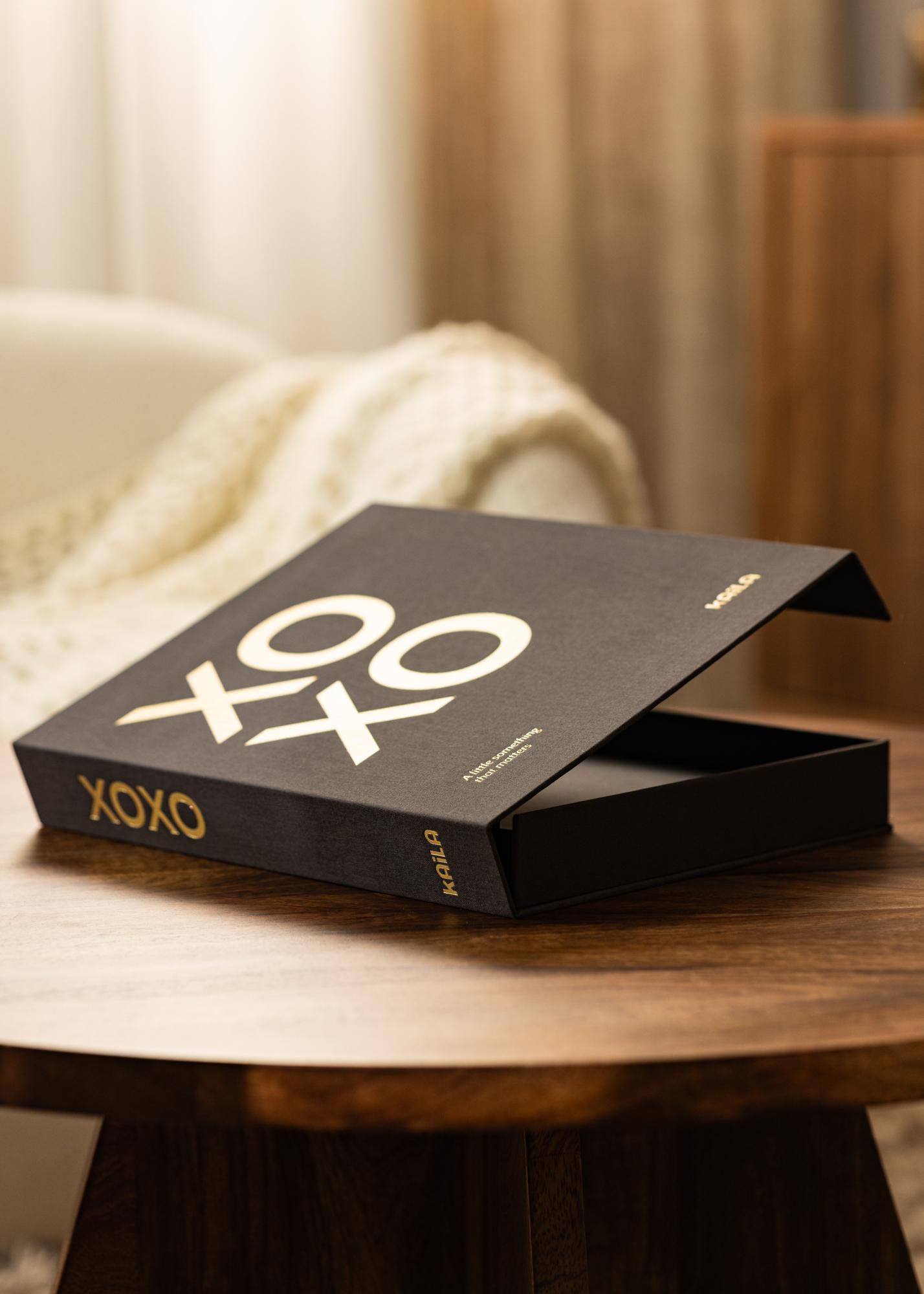 This stylish photo album has a clever design that makes it also a trendy Coffee Table Book. This Coffee Table Photo Album has a cover that’s elegantly wrapped in black fabric. Printed on the front and back of the album in gold-coloured lettering is the well-known farewell "XOXO" where X means kisses and O means hugs. This modern title is accompanied by the subtitle "A little something that matters" which is printed in the left corner of the album. The unusual and playful design means that this stylish photo album is guaranteed to stand out in the crowd.