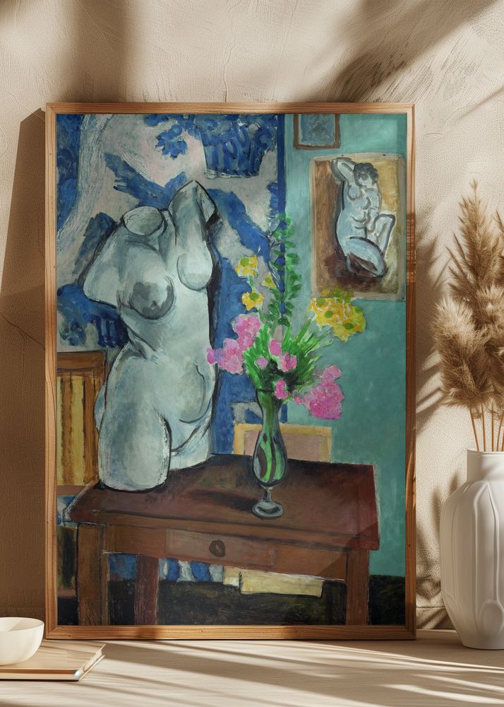 The colour palette in this poster is versatile, featuring muted earthy tones such as brown and beige on the table and sculpture, contrasted with deep Blue shades in the background. The flowers add a lively touch with their Yellow and Pink blooms, highlighting and enhancing the artistic expression. This print is perfect if you want to add a mix of classic and modern to your décor.