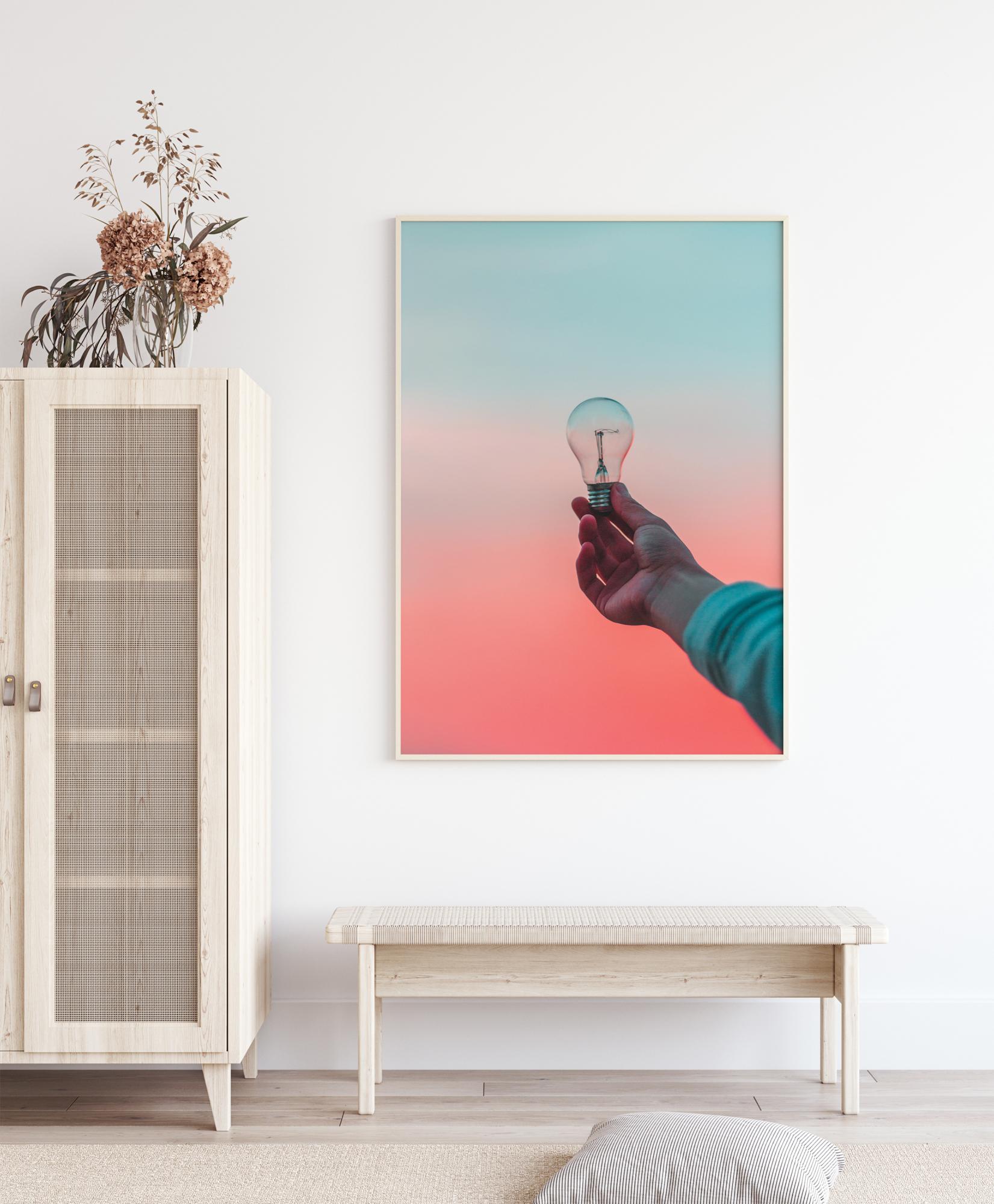 A simple print of lightbulb held towards the sky. The beautiful pale blue sky enhances the turquoise jumper of the person holding the lightbulb. The lower part of the prints reflects a beautiful pink tone that is reflected in the lightbulb. A soothing print that would look beautiful hung against a pastel coloured wall.