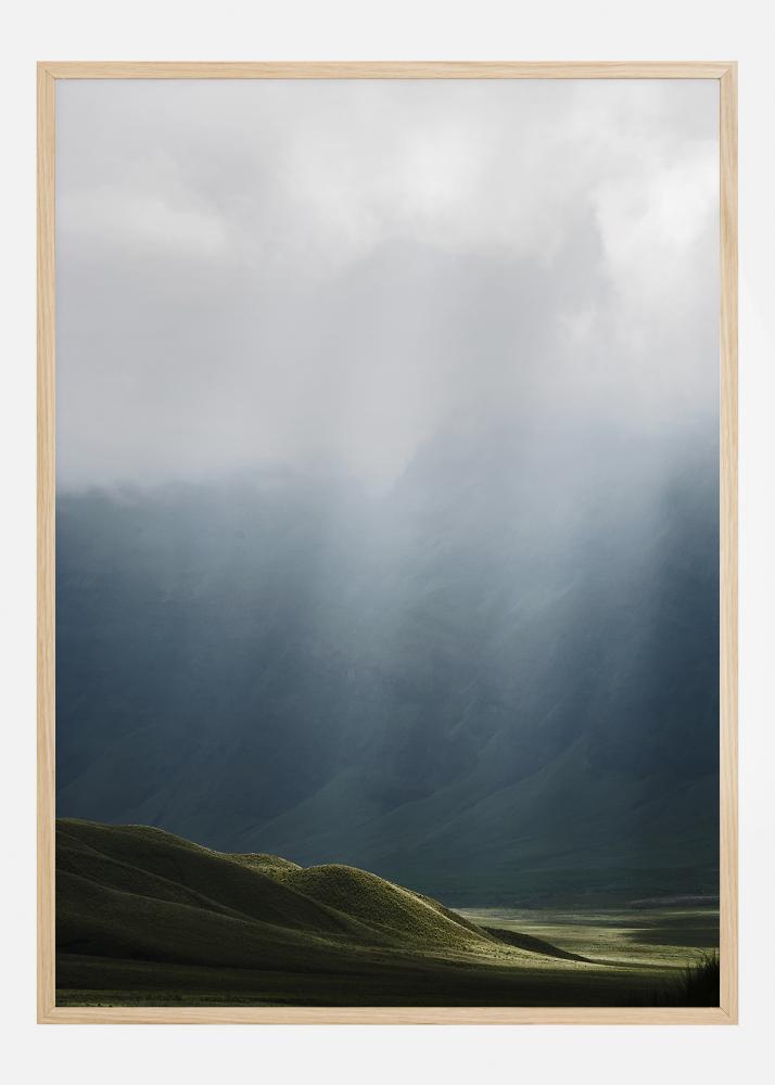 A stunning landscape image with the dark green hills in the foreground. The rising hills on the other side are barely visible due to the early morning mist. The soft greens and greys all create a soothing and relaxing feeling. A ideal print to hang in a living room.