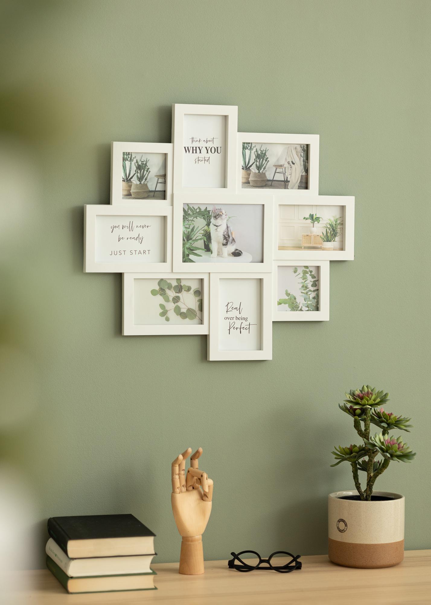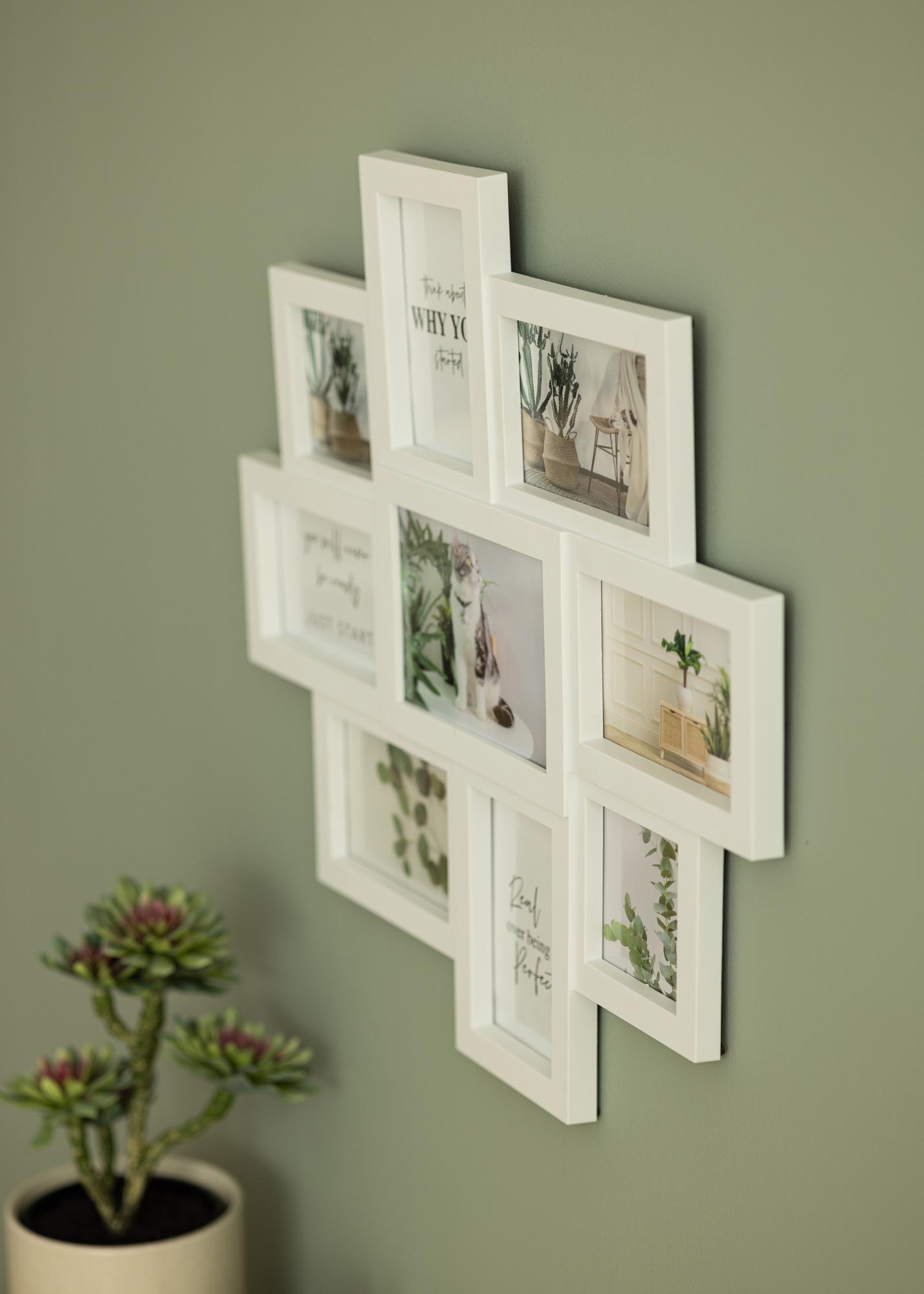 With this stylish collage frame you can bring together your favourite photos in one frame! The frame holds a total of 9 photos: 2 pictures 10x10 cm, 2 pictures 10x15 cm and 1 picture 13x18 cm. There is space for pictures in both portrait and landscape formats giving you greater flexibility when choosing your photos. The frame has an asymmetric shape that is both eye-catching and modern.