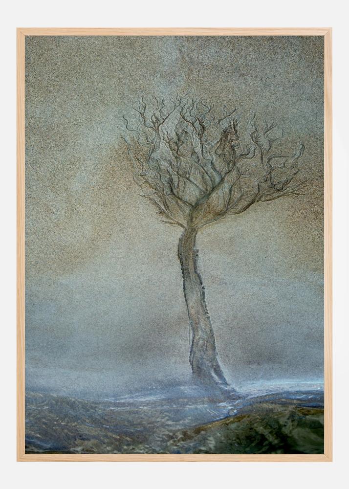 A landscape print of a melancholic lonely tree. The print depicts a faint panoramic view of plains with the hills in the foreground. A solitary leafless tree dominates the foreground. The soft greys and browns create a melancholic and lost feeling. Hang this print in a quiet environment space.