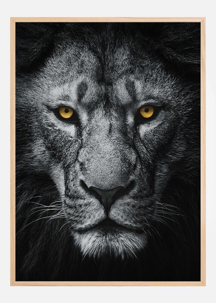 This bold and suggestive poster depicts the lion's portrait with an impressive level of detail. The image is in black and white except for the lion's eyes, which glow in a strong and vibrant yellow color, creating an irresistible focal point in the motif. The thoughtful use of color and contrast gives a sense of intensity and presence that captures and holds the viewer's attention. This poster is perfect for those seeking a sense of wild and natural power in their decor.