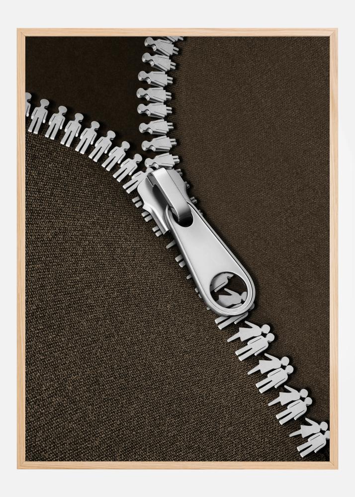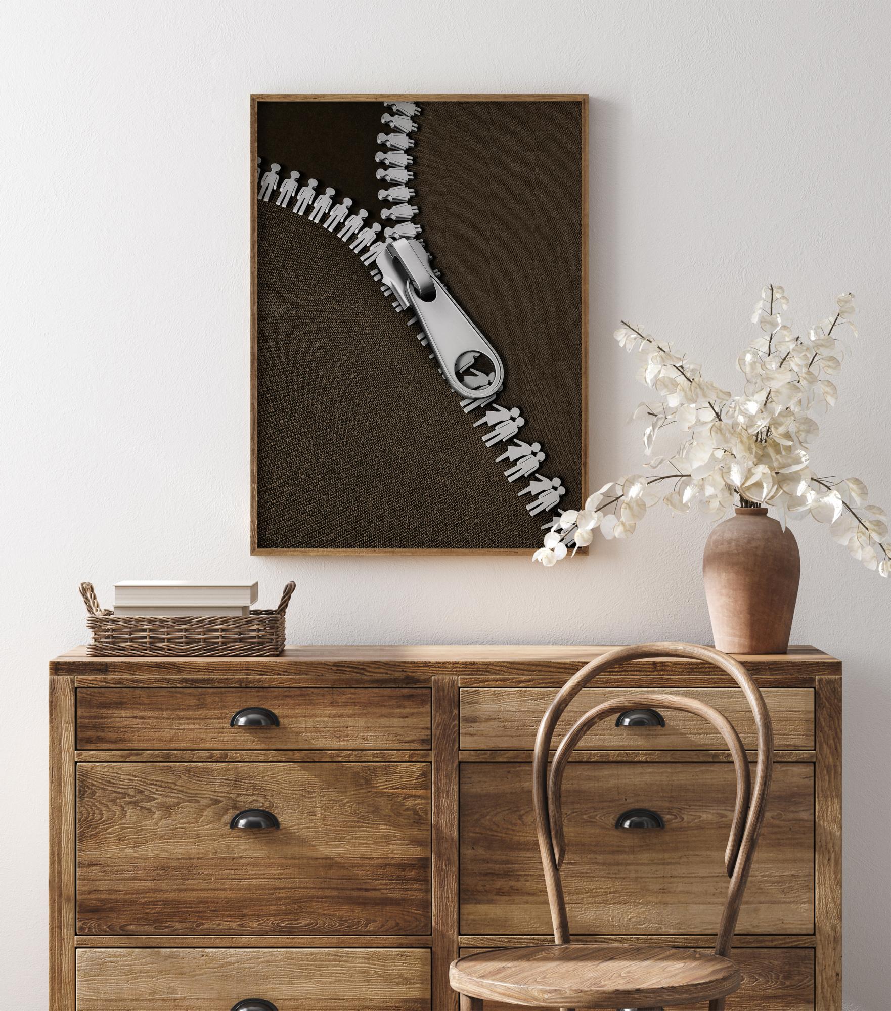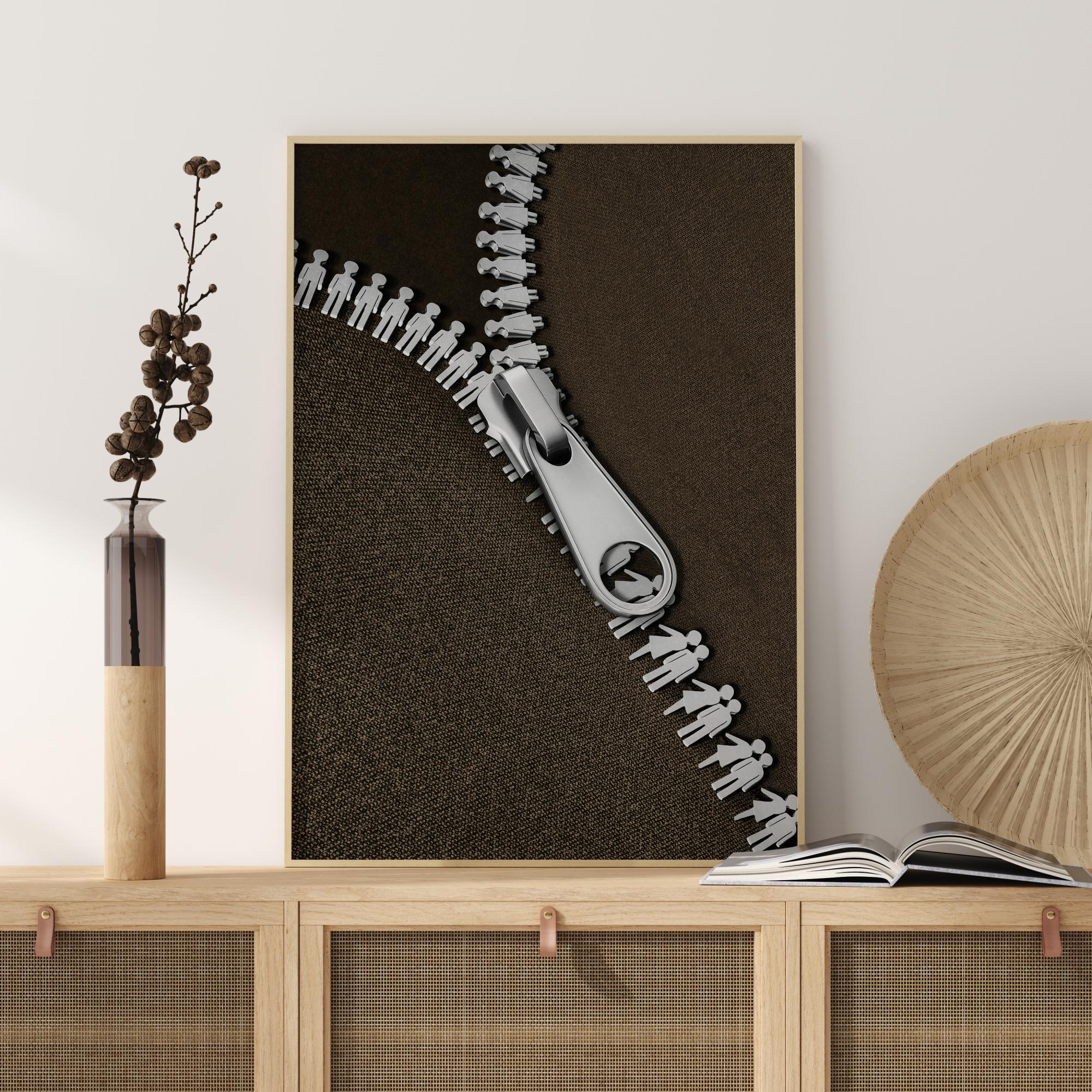 A minimalistic print of a silver coloured zip. Set on a black background, the silver coloured zip represents two lovers meeting. Set on a dark brown fabric, the silver clasp hangs over the zip figures. A fun image for anyone interested in fashion.