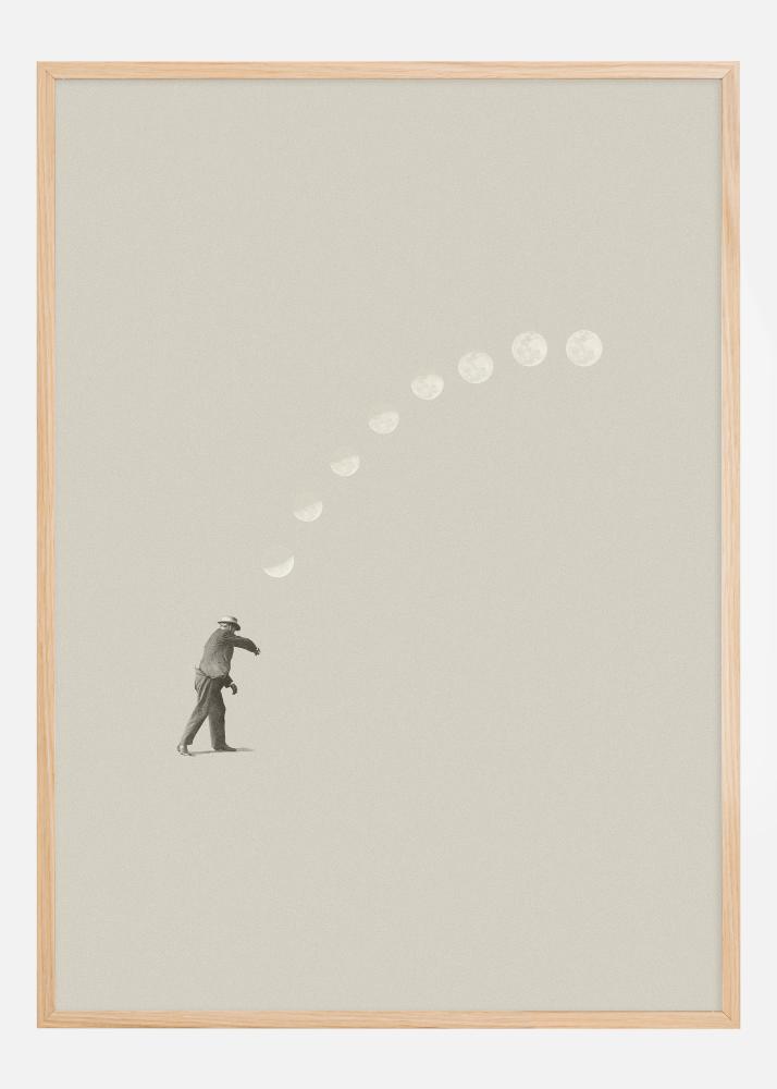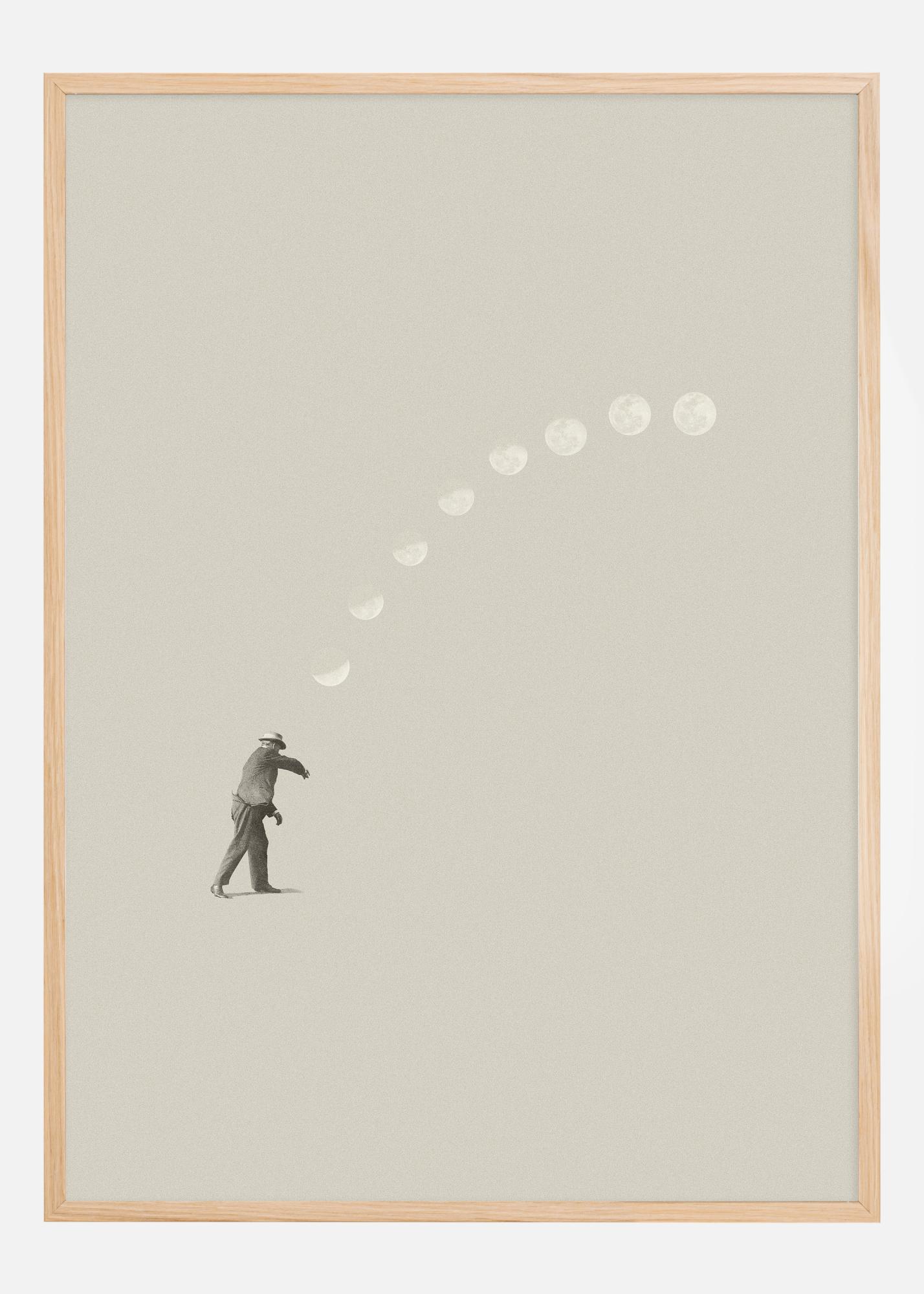 This poetic poster portrays a silhouette of a man who, with a powerful movement, throws a moon into the sky. It is a scene that captures the moment of a moon elegantly being sent off and forming a path of different moon phases. This action symbolizes perhaps dreams and ambitions being launched towards infinite possibilities. The minimalism of the image enhances the powerful gesture and leaves room for the viewer to fill in their own story and meaning.