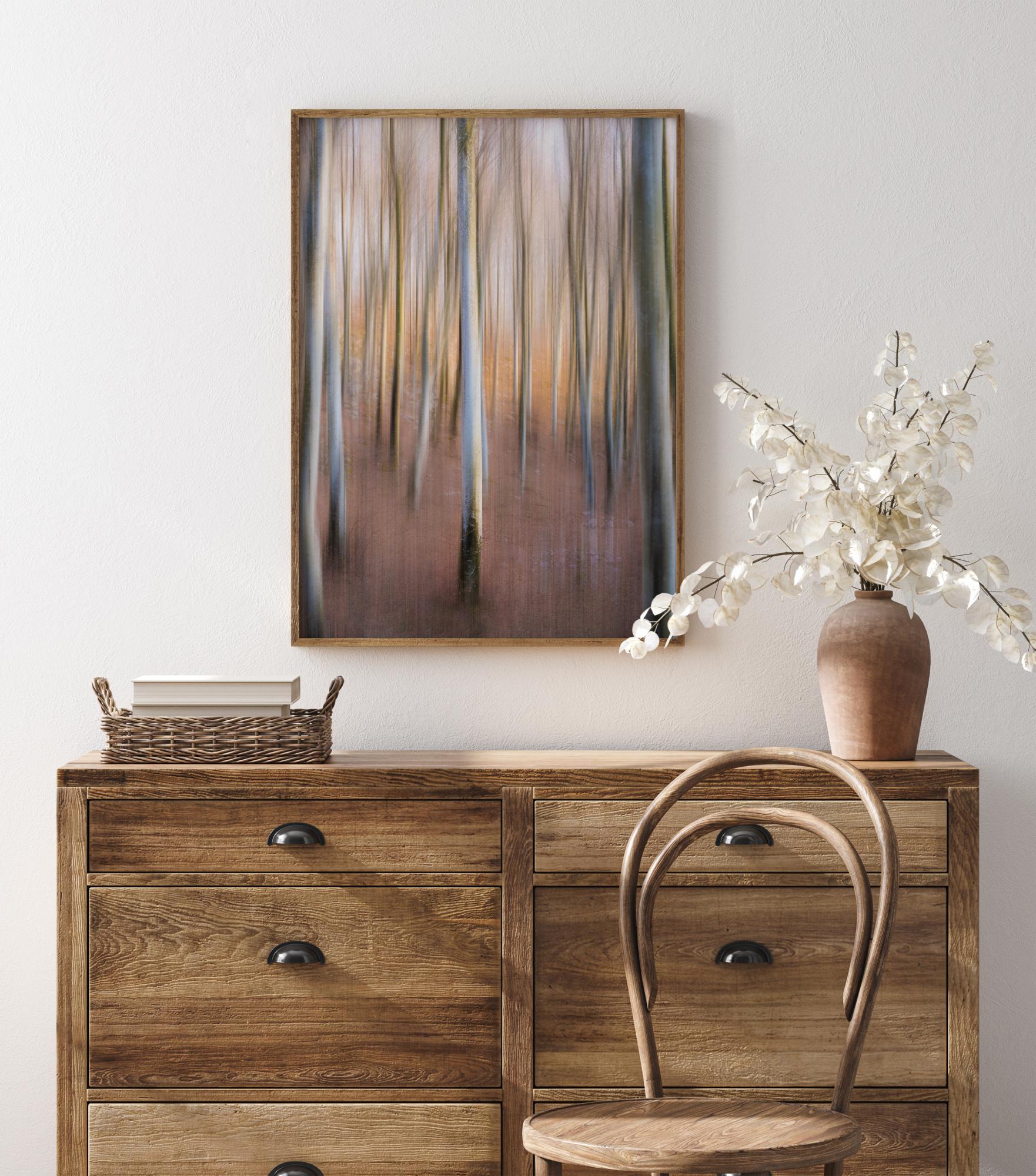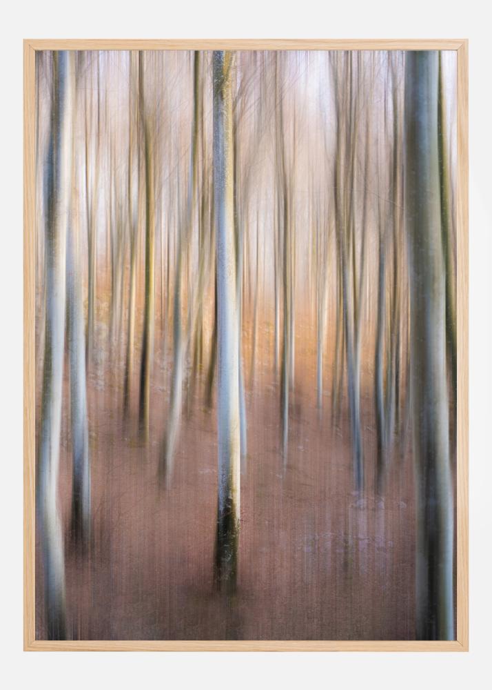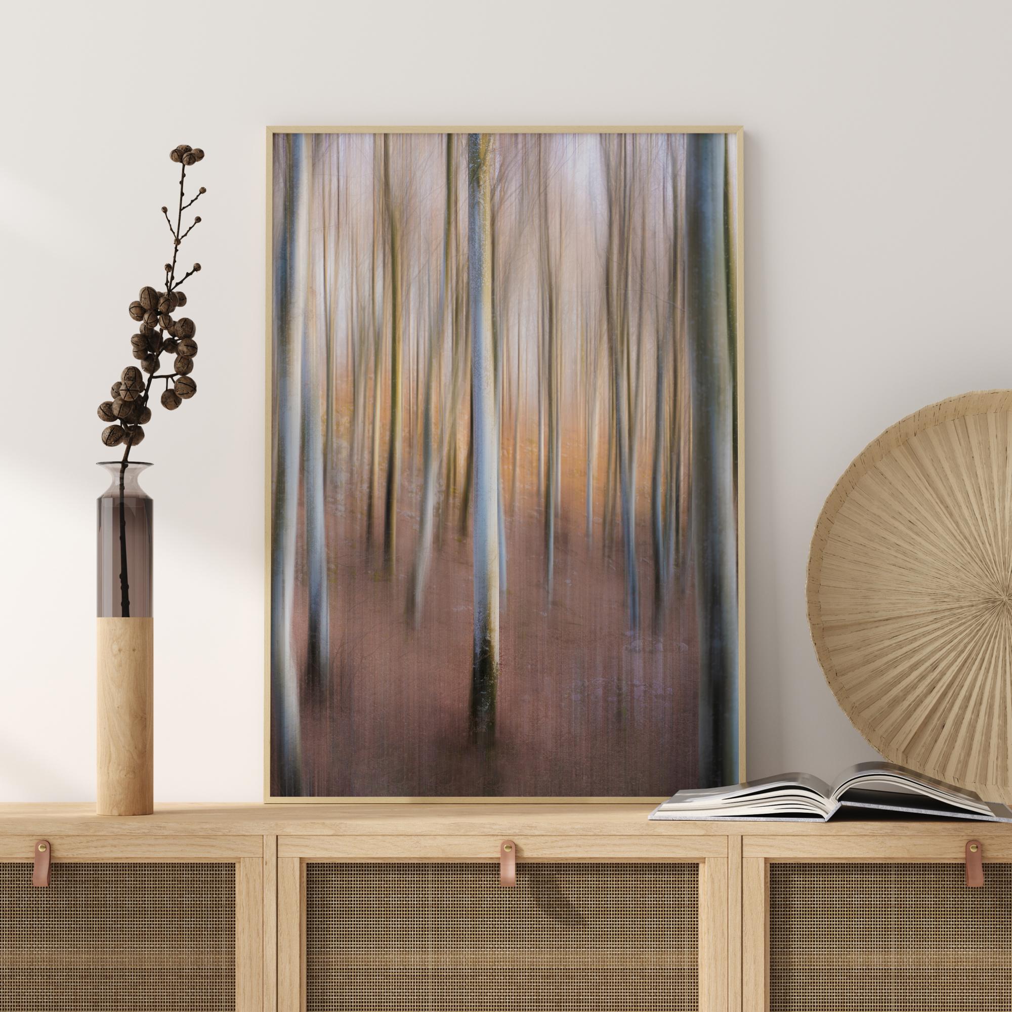 A beautiful but mysterious image of a magic woodland. With the natural light shining through, the magical pastel colours enhance the tall tree trunks. Hear the silence of the woods when you hang this image in your home