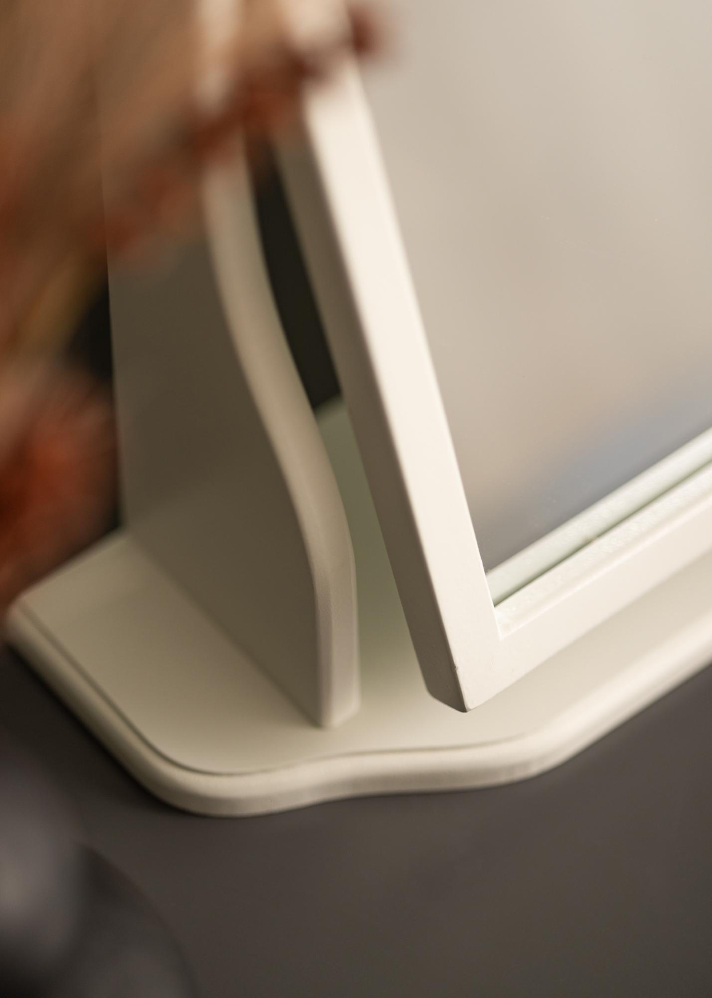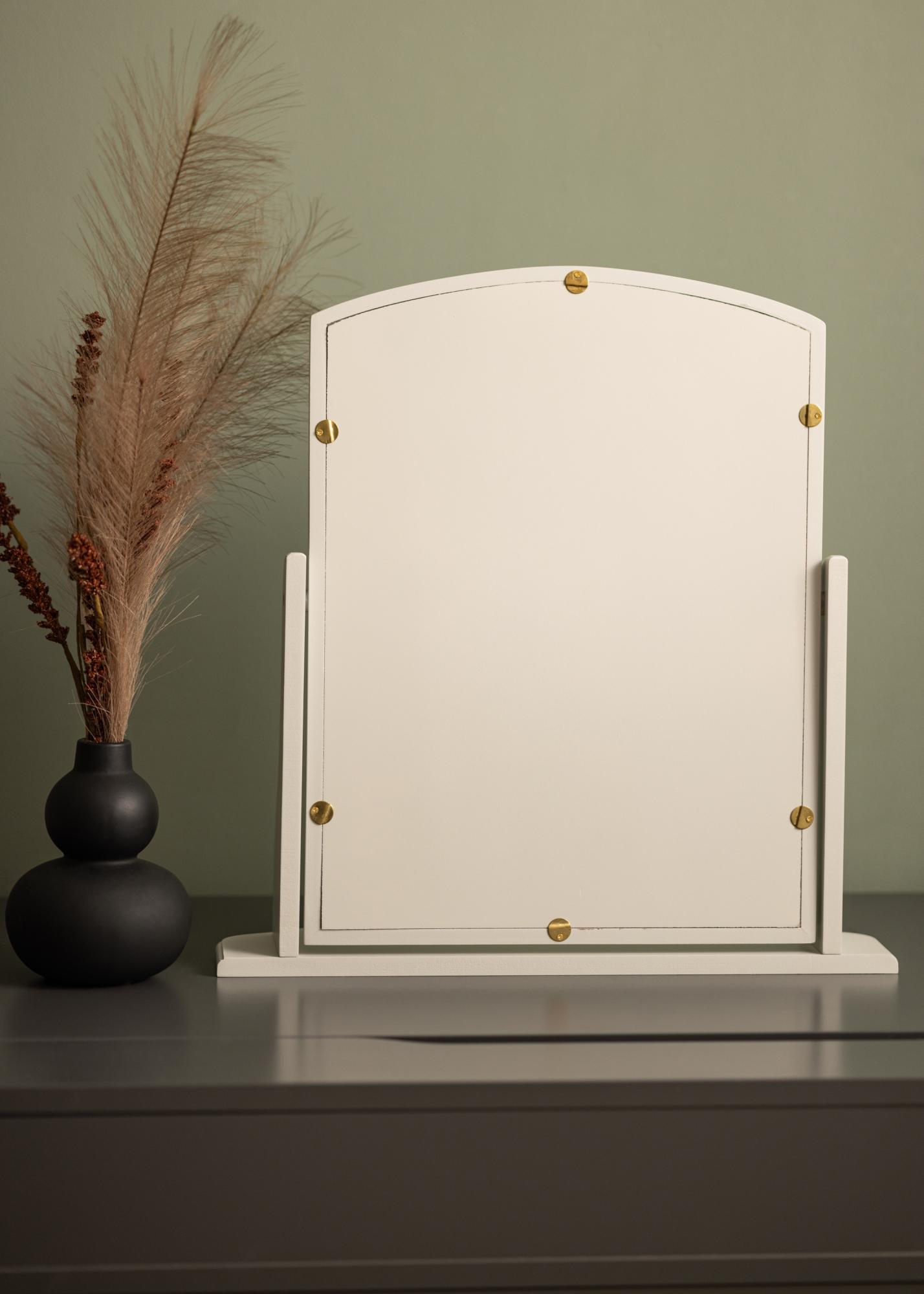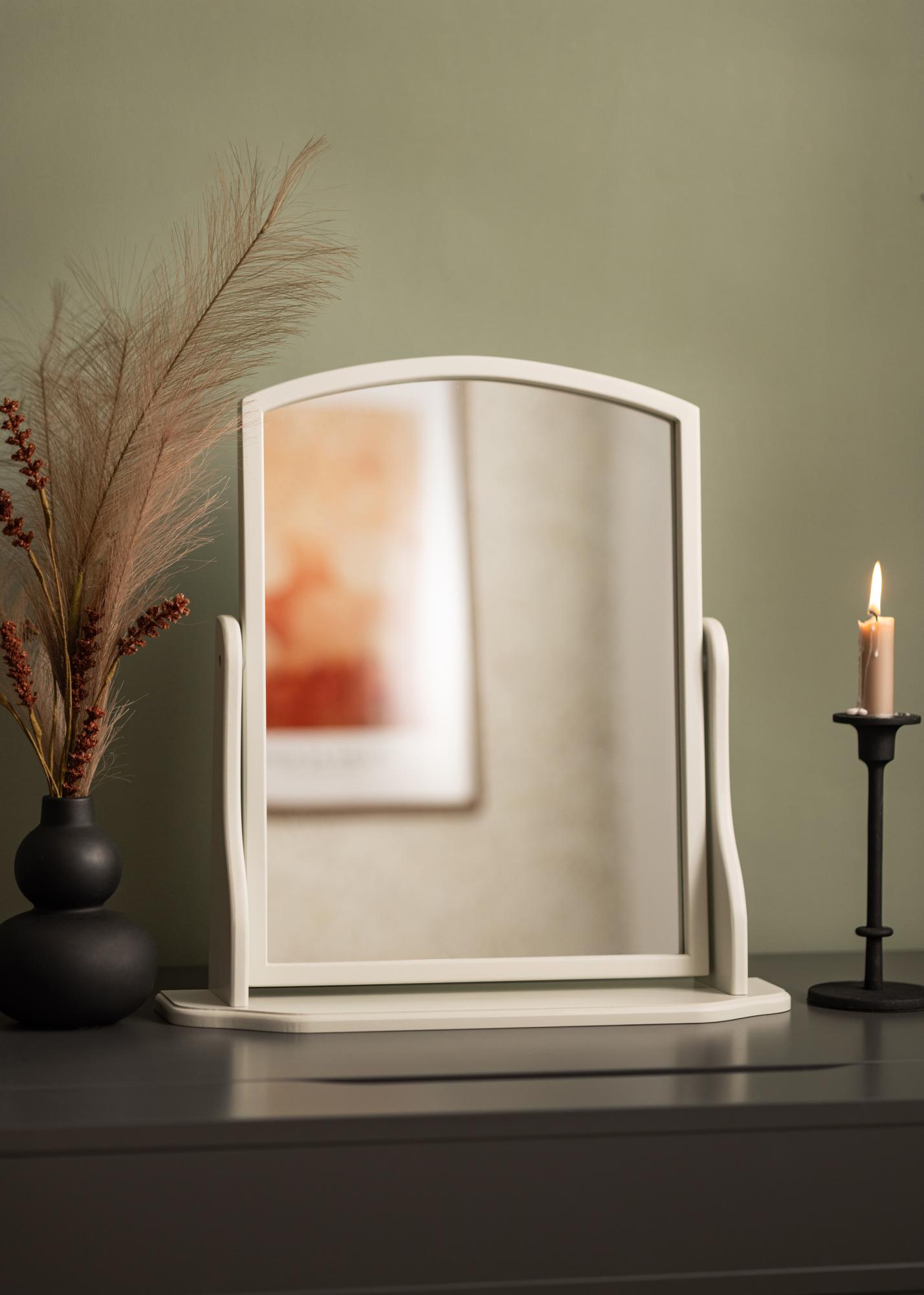 This mirror is designed with a gray frame that adds a subtle and sophisticated touch to the room. It stands solidly on a sturdy base, making it ideal for use on a table or dresser where you get ready for the day or night.