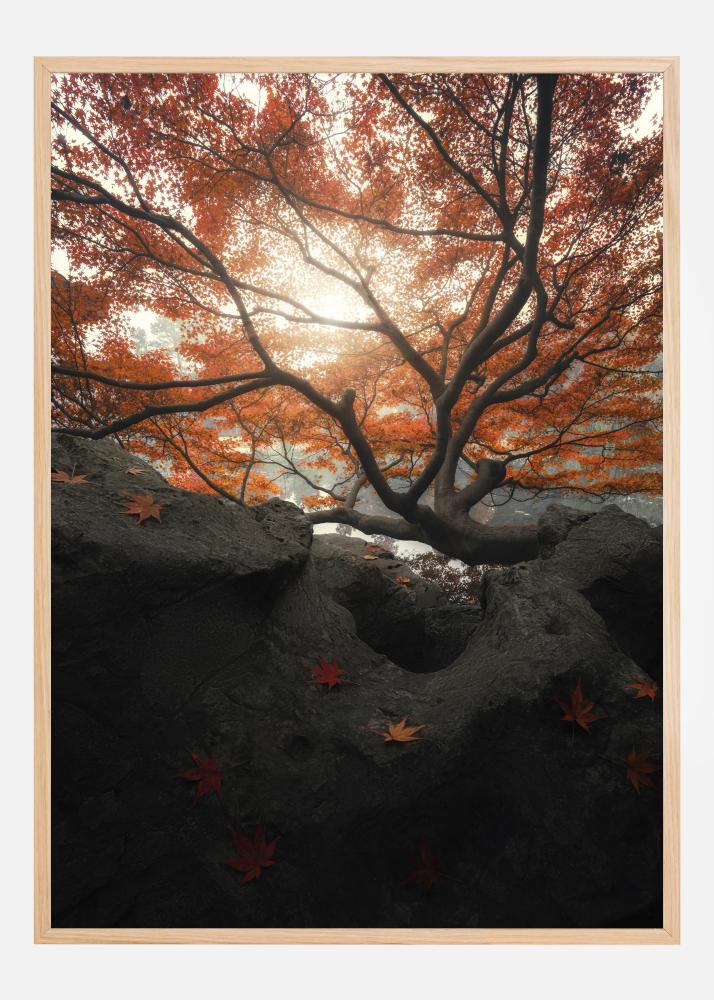 A breath-taking nature print of a beautiful, orange coloured maple tree. Taken from a bottom-up perspective, the bright sunlight beams through the branches creating a warm relaxing feeling. In the foreground, single red and orange leaves have fallen on a trunk. Add a touch a nature with this print in your home.