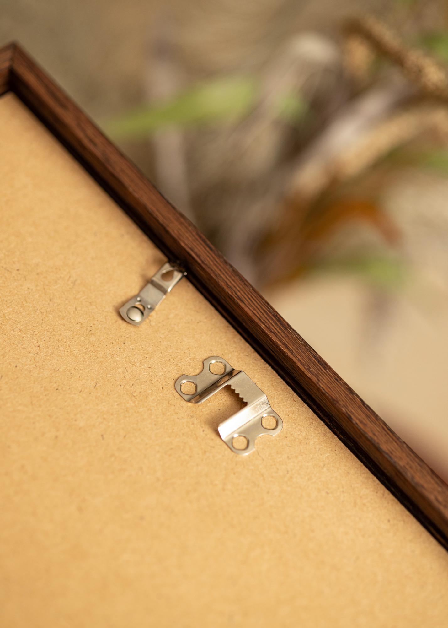 The dark brown wood structure with distinct grain creates an authentic wood feel and adds a rustic charm to your home. Whether you want to hang it horizontally or vertically, the practical metal hangers on the back make it easy to adapt to your needs. The frame is designed to fit subjects in the size 70 x 100 cm, making it ideal for larger artworks or photographs.
