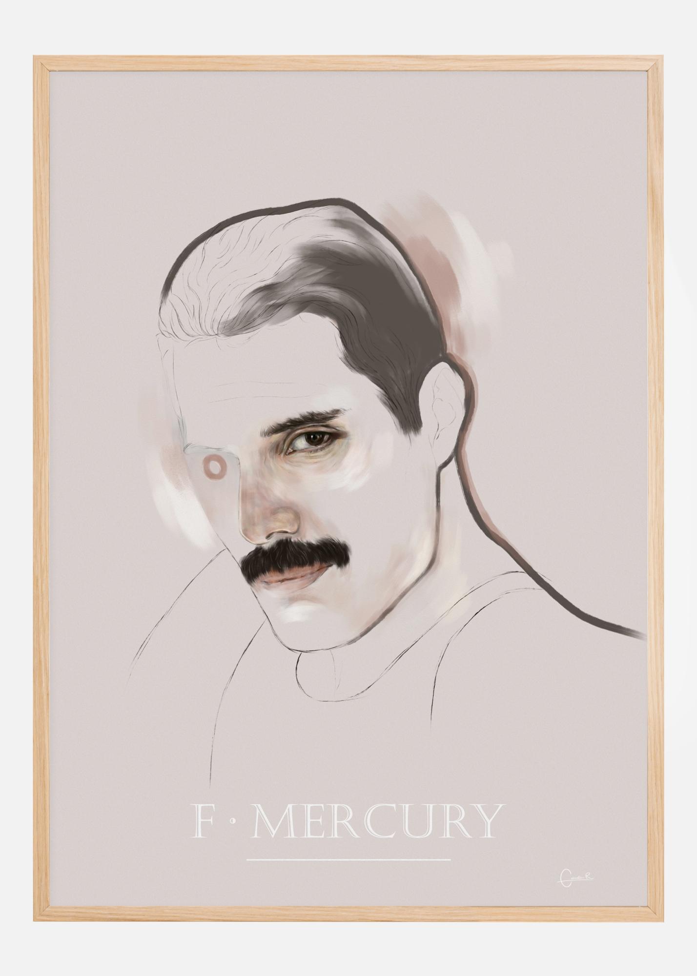 A striking portrait of Freddie Mercury on a pale pink backdrop. With his left eye capturing your gaze, his right eye is replaced with a ring. His bold black moustache and jet black hair are the main features of this striking image. Bold strokes outline his head and shoulders. Hear the music when you hang this portrait in your home.