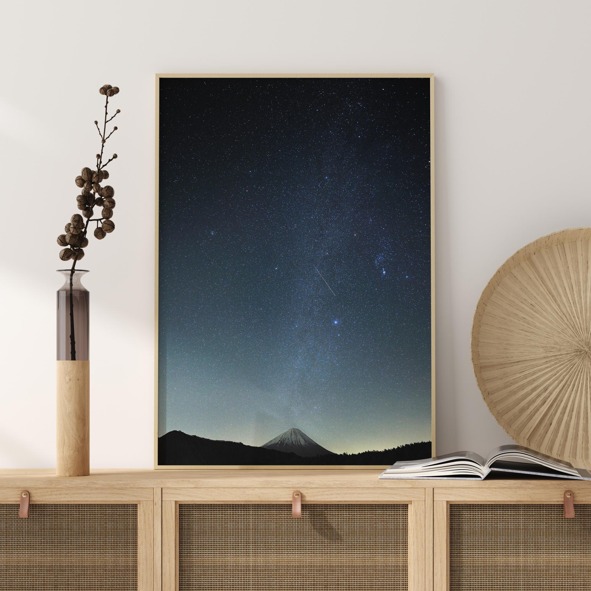 A beautiful print of the meteor night. With a snow covered mountain standing in the distance, there is a mystical feeling about the magical white stars. A ray of natural light beams from behind the mountain creating that magical and mystical feeling. Ideal for a child's bedroom.