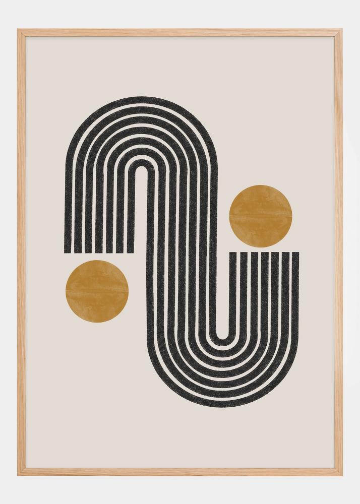 Discover a world of sleek beauty with our poster that highlights contrasts through both form and color. This print features a dynamic black and white pattern of lines forming a softly curving shape, balanced with two ochre-colored circles that provide a warm and earthy feel. This minimalist yet impactful design is inspired by mid-century modern aesthetics and offers a sense of calm and balance in any space it is placed in.