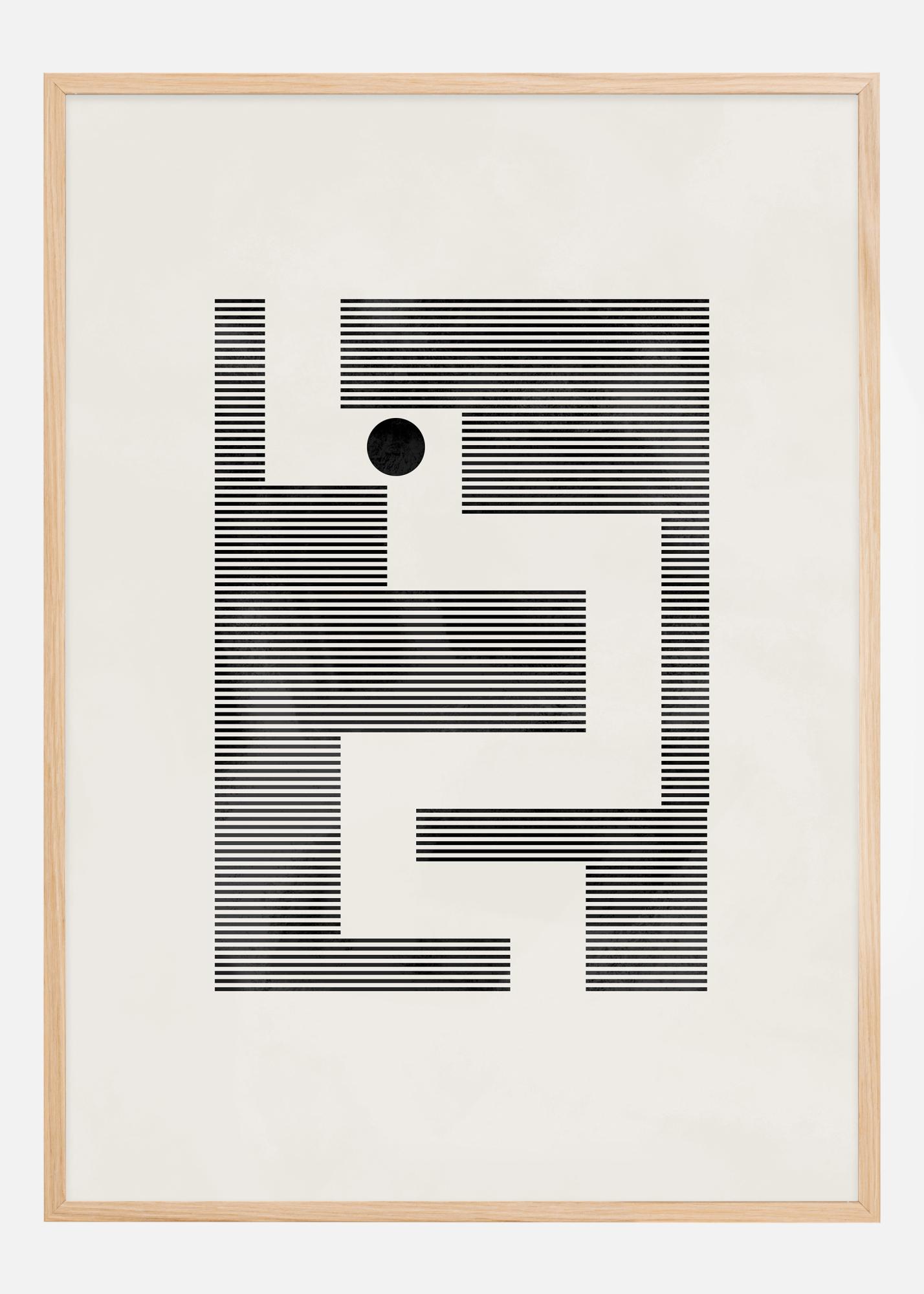 This artistic poster offers a minimalist interpretation of a labyrinth, executed with black lines forming an intricate weave of geometric shapes against a cream-colored background. The solitary black circle placed at the center of the labyrinth acts as a visual anchor point, while also providing depth and focus to the otherwise simple motif. This design plays with the viewer's eye and encourages a visual exploration of its paths and dead ends.