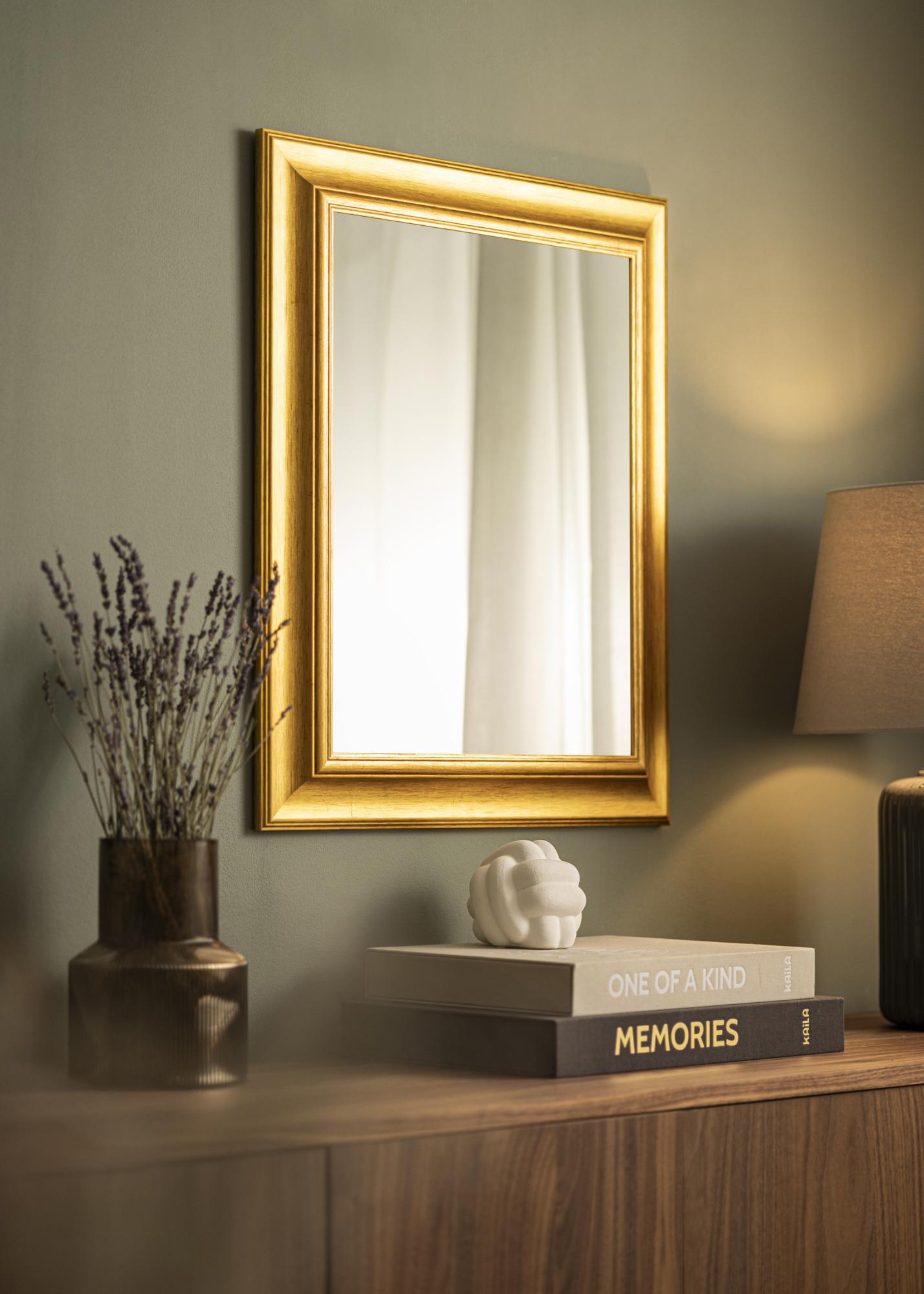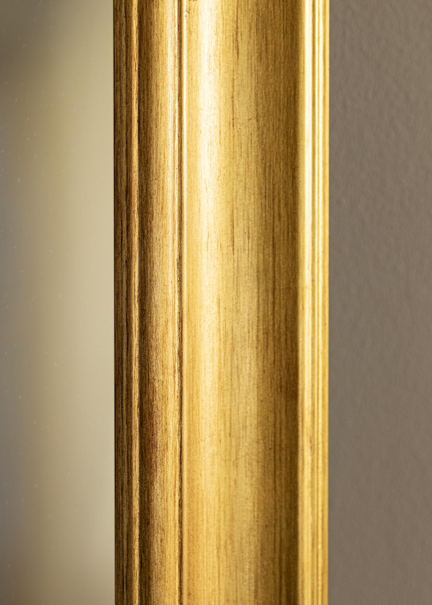 The frame is made of pine and has a beautiful antique gold finish. The brushed surface with subtle variations gives the mirror a slightly patinated feel, which contributes to its unique character. The thin lines along the edges create a sophisticated richness in detail that catches the eye and enhances the mirror's classic expression.