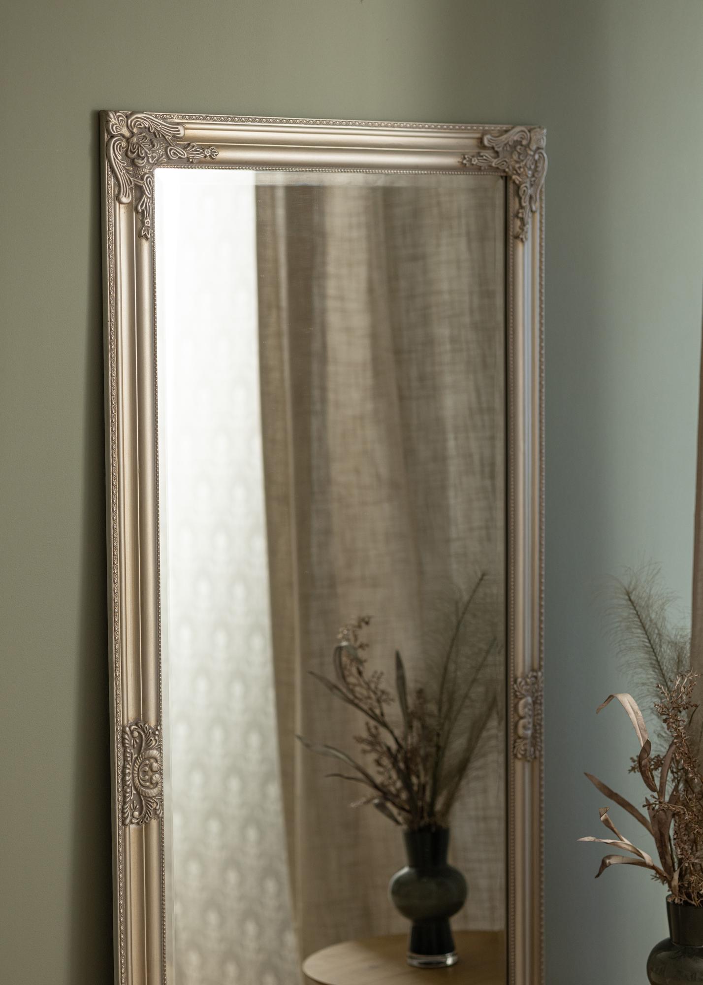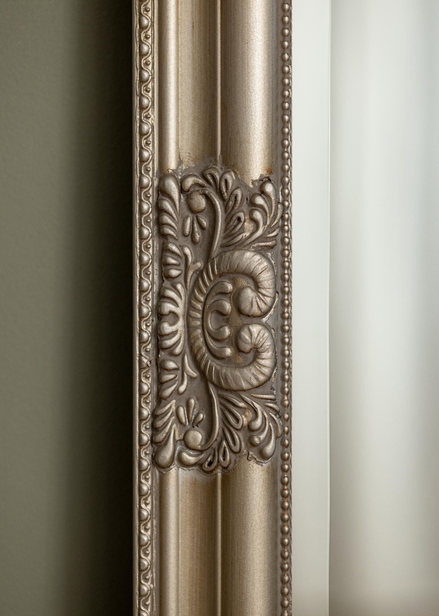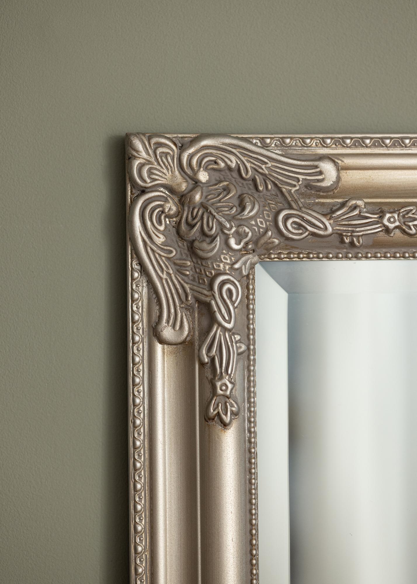 The elaborately ornate frame is full of delicate details and patterns, giving the mirror a vintage charm that is hard to resist. The silver-coloured frame enhances the mirror's shiny surface and adds a luxurious atmosphere to the room. This mirror is an ideal companion for anyone who appreciates classic elegance and wants to create a refined and welcoming environment.