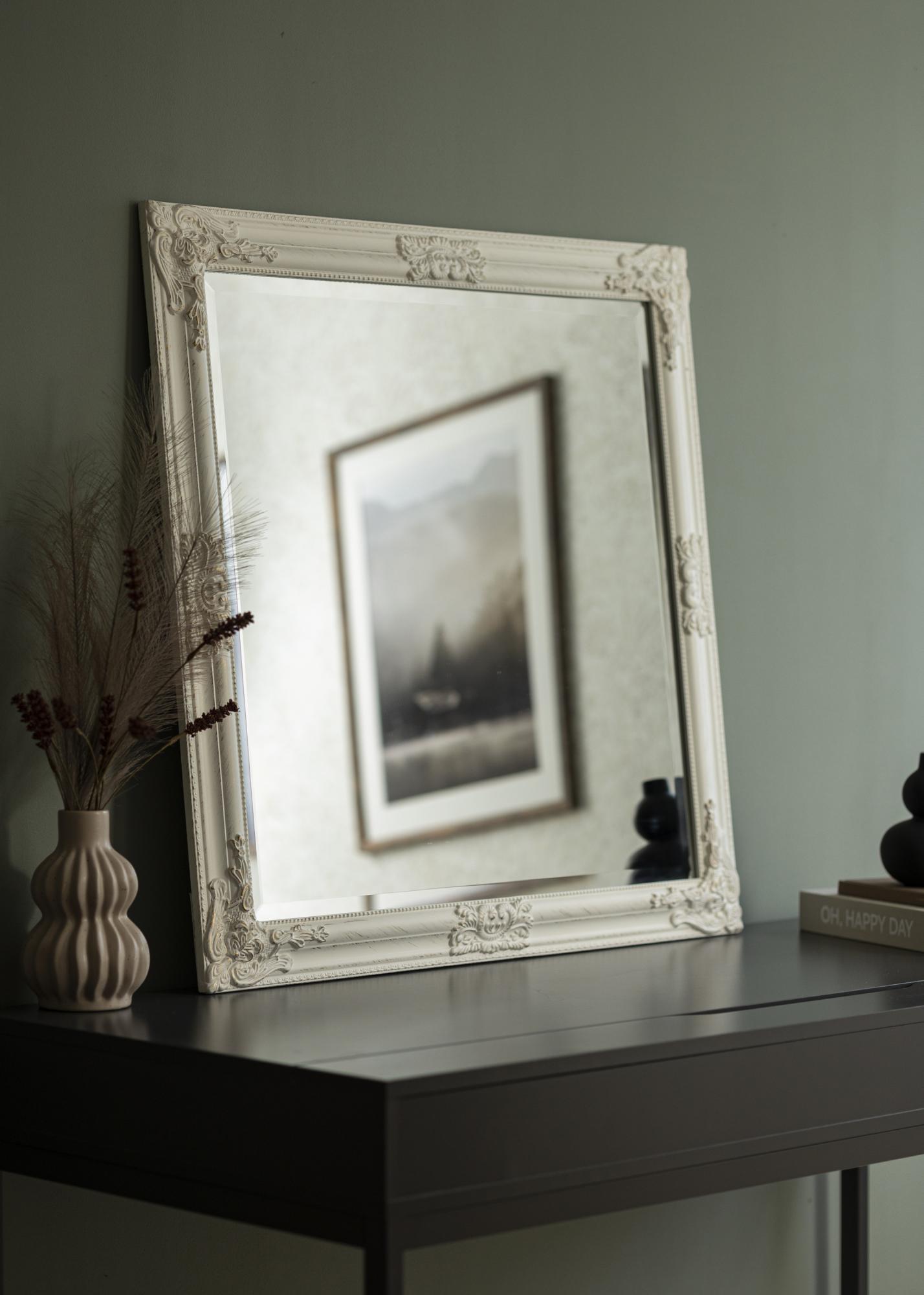 Discover the elegant square mirror measuring 80x80 cm, a perfect size for both functional and decorative purposes in your home. This mirror has a square shape that gives a symmetrical and balanced feel, making it a striking addition to any room. The white frame is beautifully adorned with classically inspired details, creating a timeless elegance and charm.