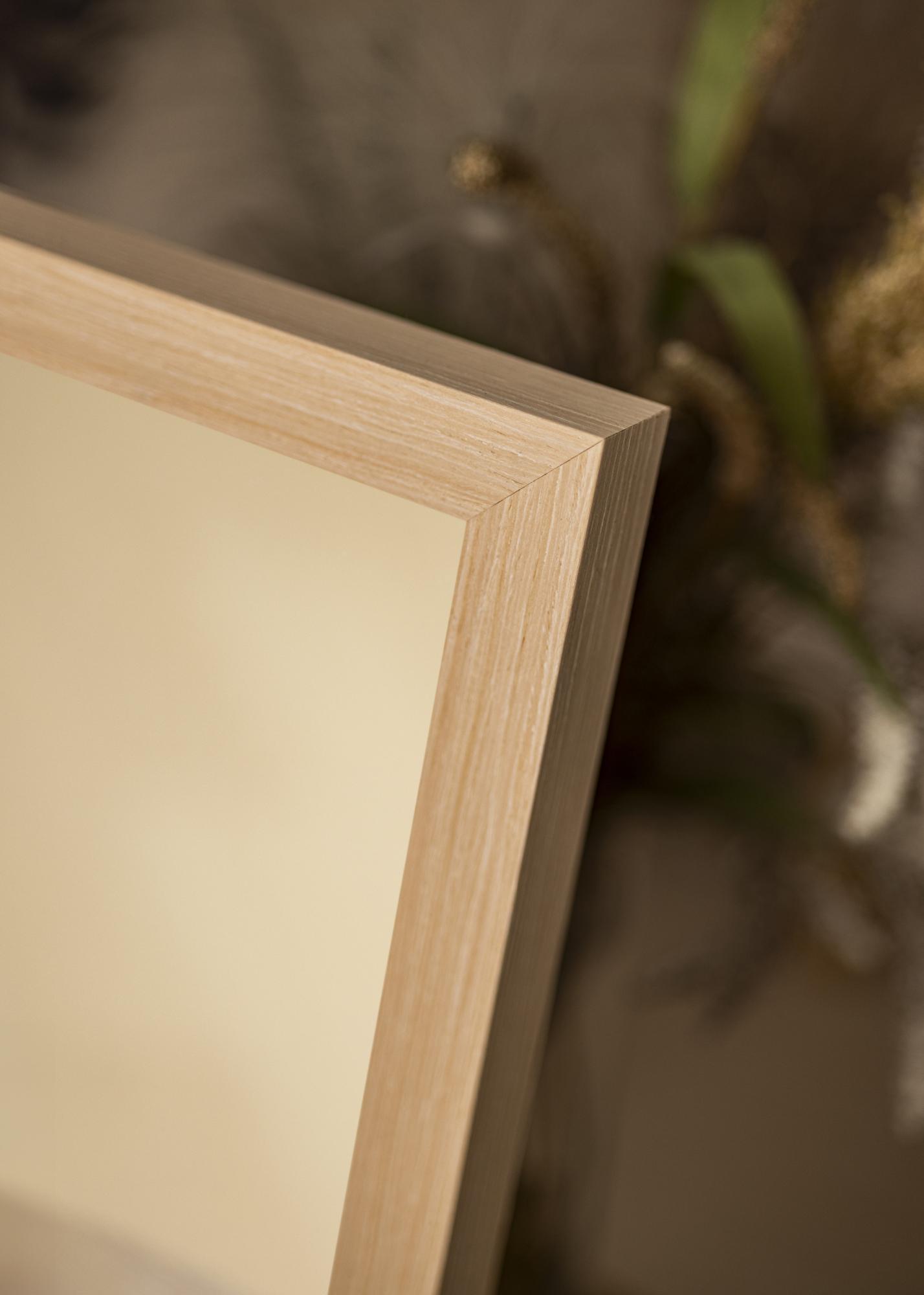 The frame of the mirror is 28 mm wide and has a depth of 33 mm, providing a stable and robust feel without dominating the room. Made of pine, it combines durability with a lightness that makes it easy to handle and mount. The satin matte finish enhances the natural structure of the wood without reflecting light, creating a pleasant atmosphere in the room.