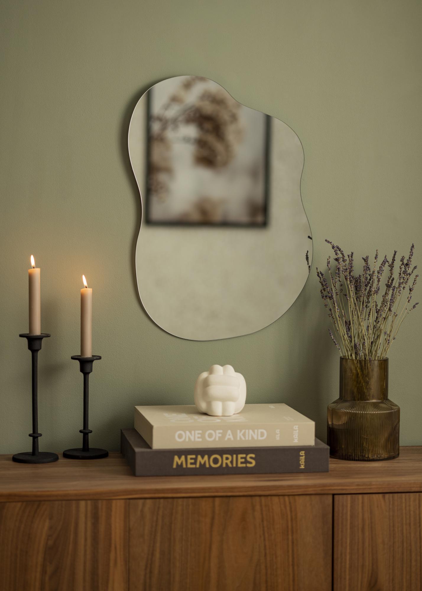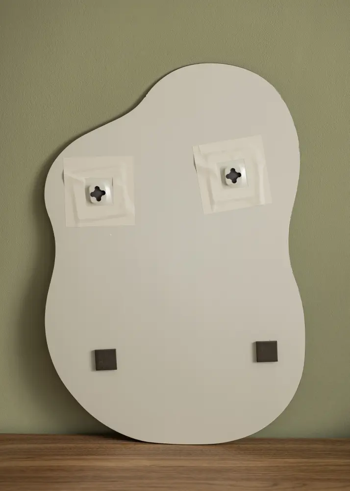 Curvy Cloud är en elegant väggspegel i en unik design med asymmetrisk form. Kanterna skapar ett mjukt vågigt mönster som – tillsammans med avsaknaden av spegelram – ger ett minimalistiskt intryck. Även det tunna spegelglaset på 4 mm bidrar till den känslan. Spegeln kan fästas på väggen med hjälp av fästena på baksidan.