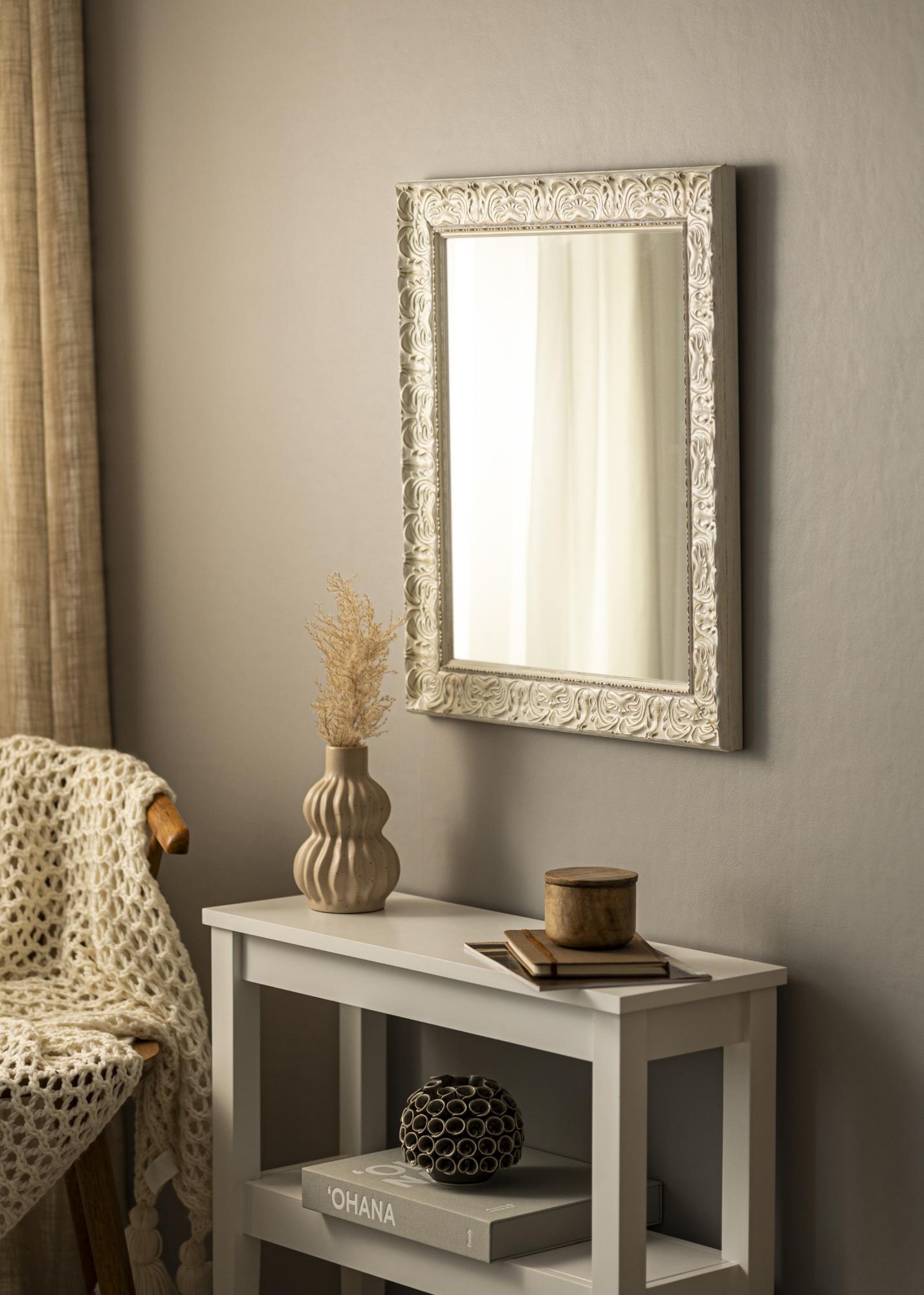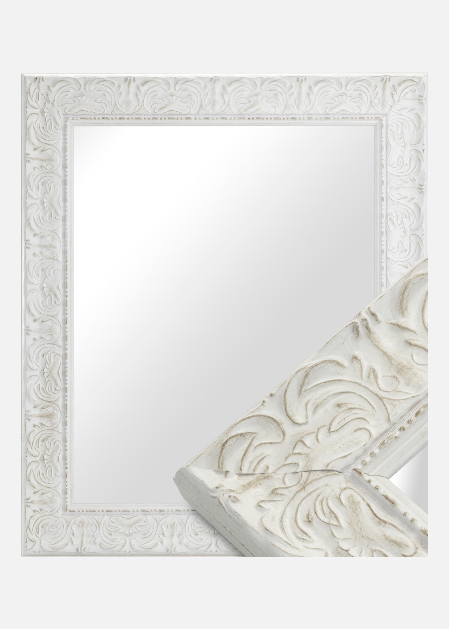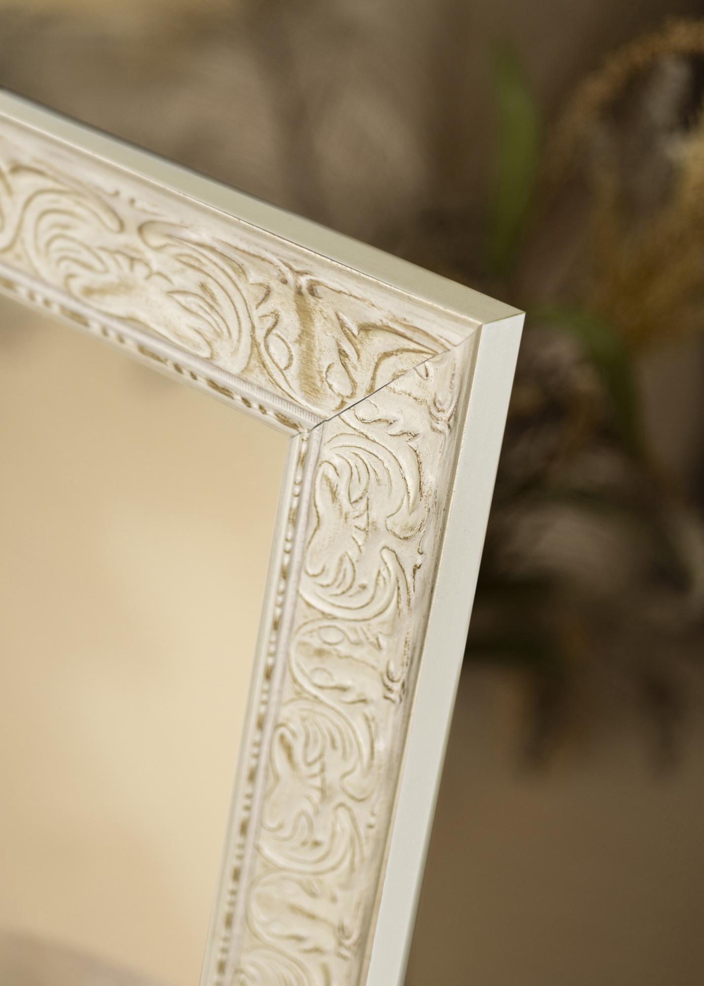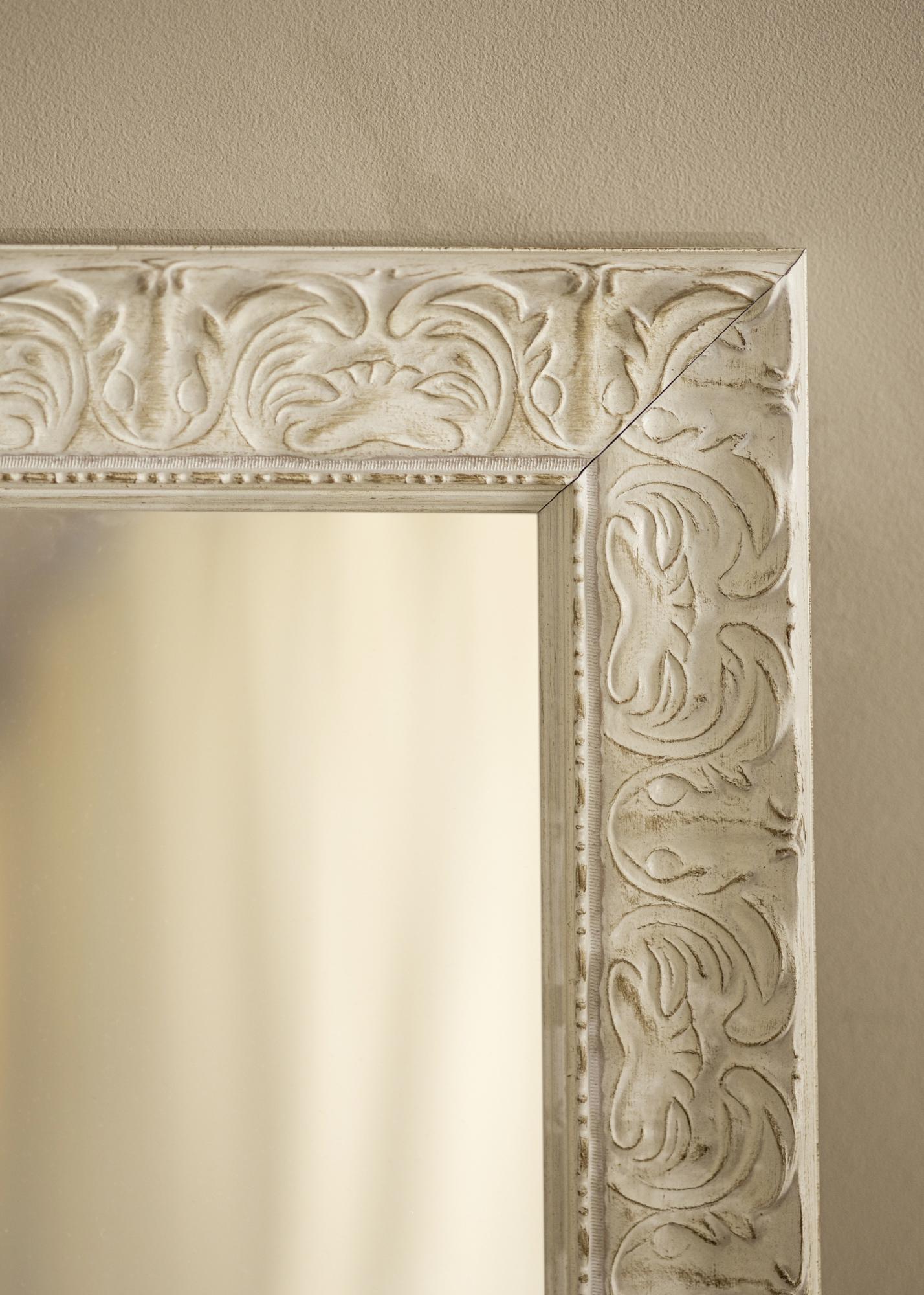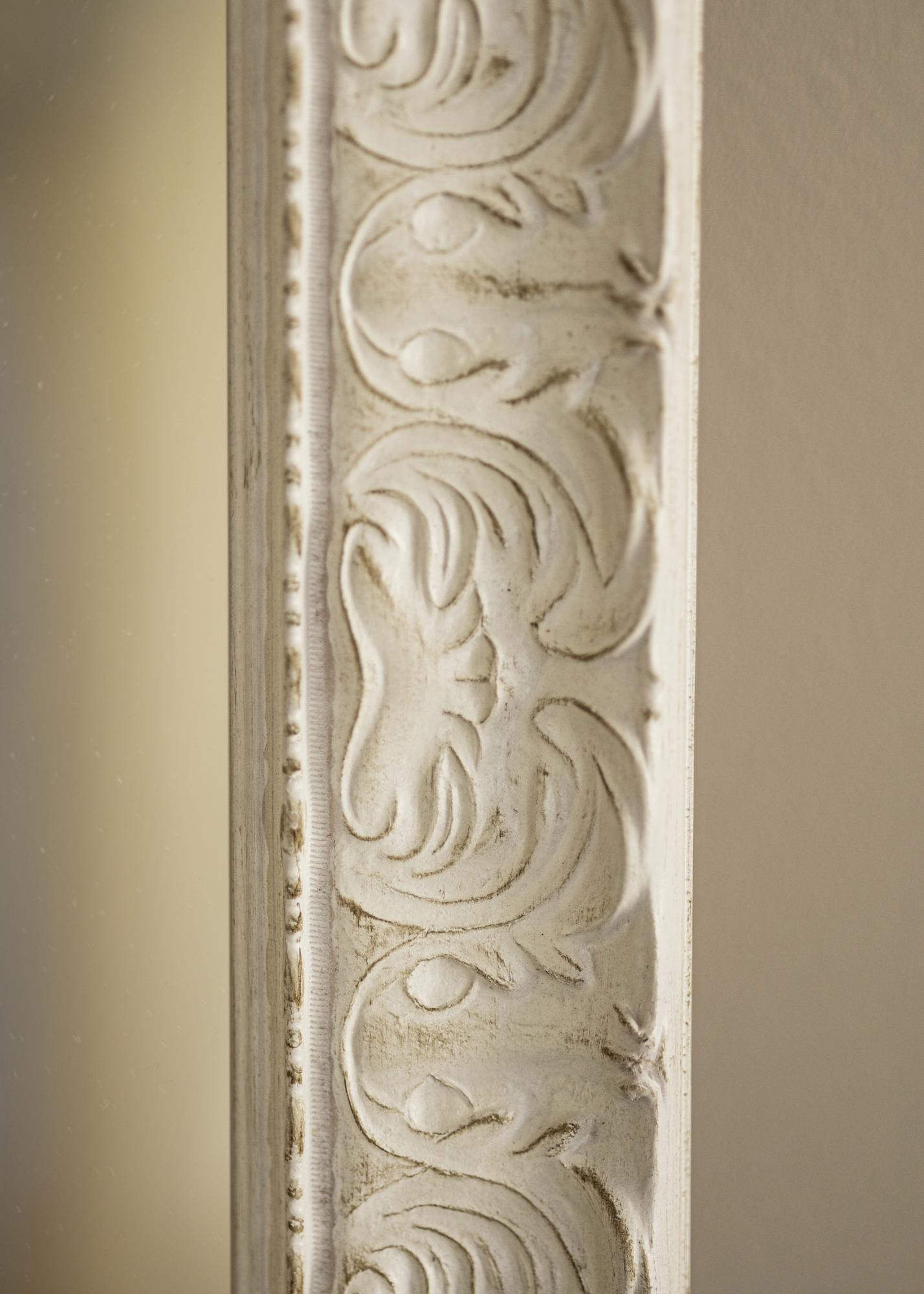 The mirror's antique white finish with decorative relief and subtly worn surface gives it a unique character. The ornate details enhance its classic expression and make it a focal point in the room. Whether you have a modern or traditional interior, this mirror will blend in and at the same time add something extra.