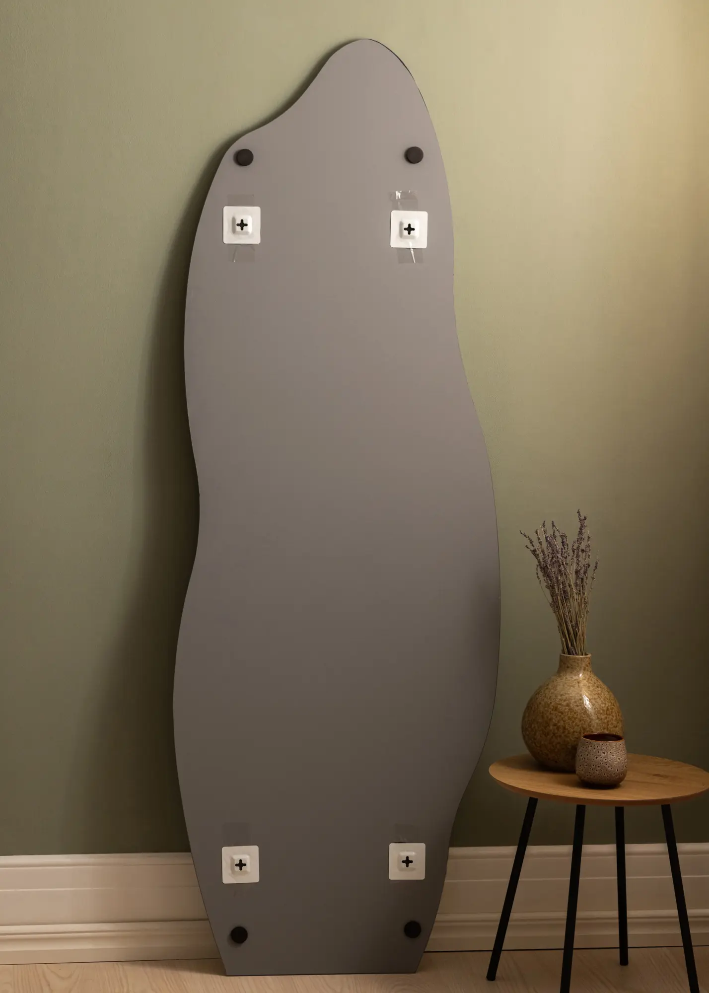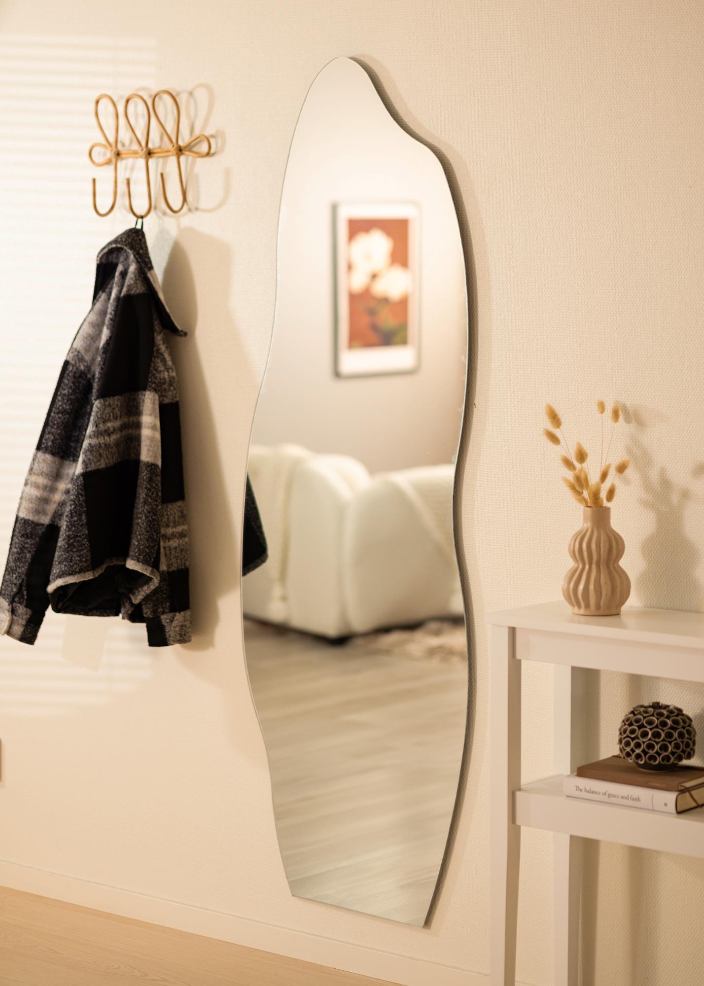 The mirror has a unique wave-like shape that is wide at the base and gracefully curves upwards. This unusual shape makes it a work of art in itself and adds a dynamic touch to your wall. It is designed to be a focal point in your home, whether placed in the hallway, bedroom, or living room.