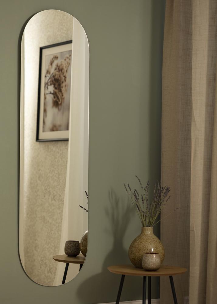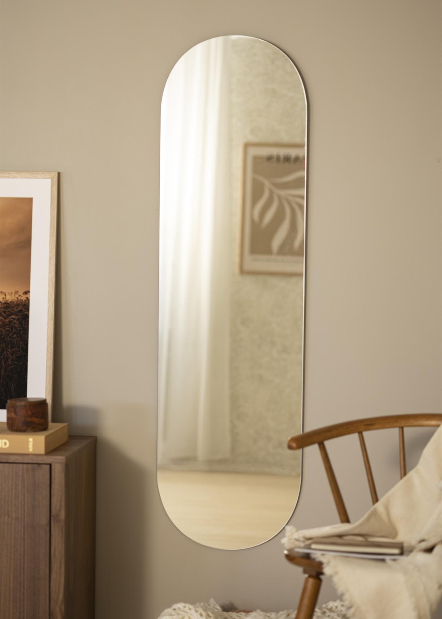 Discover the elegant and versatile wall mirror designed to complement any room in your home. With its generous dimensions of 40x140 cm, this mirror offers a practical and decorative function in your space. Its organic and elongated shape with rounded edges and a soft bend at the top creates a modern and gentle appearance that blends in with various interior styles.