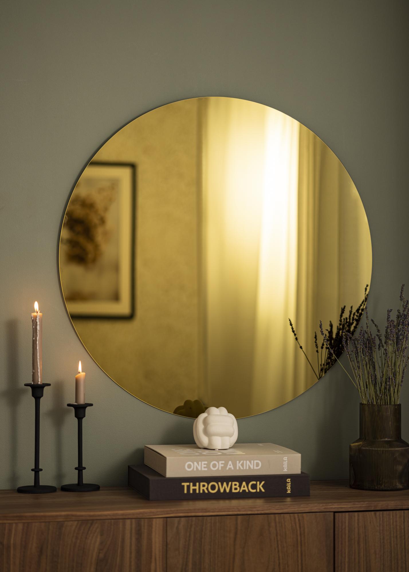 This is an elegant, minimalist wall mirror with lightly tinted yellow glass that makes this mirror an interesting home decor feature. The thin mirror glass is a soft yellow colour that is both mild and glowing in appearance. The stylish round shape is perfectly complemented by the thin mirror glass.