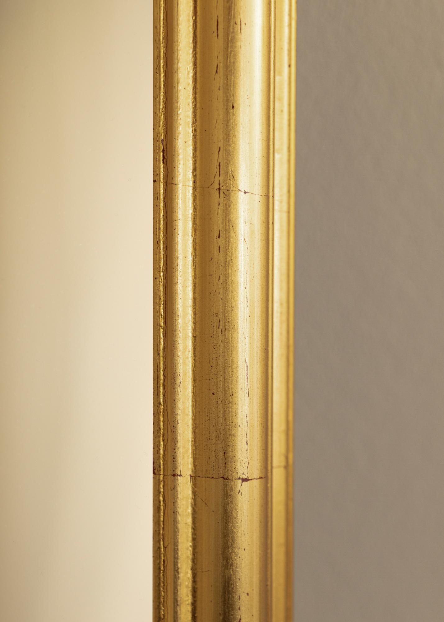 The frame is made of ayous wood and has a softly curved profile that contributes to the mirror's sophisticated appearance. The surface is antique-patinated with subtle crackling and small dark features, which gives the mirror an authentic vintage feel. The golden finish creates a warm and classic atmosphere, perfect for adding a touch of timeless elegance to your home.