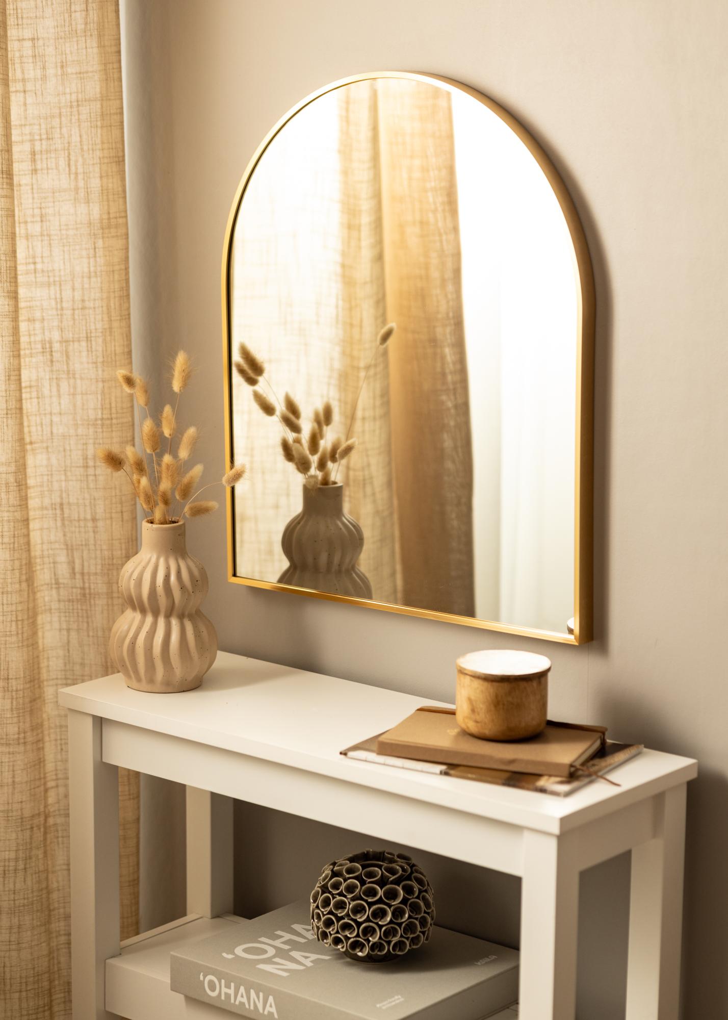 This is a modern wall mirror that’s a great addition in every room. It’s the perfect trendy decor detail to brighten up your bedroom or living room as well as being ideal for your bathroom or hallway so you can do last minute checks before you leave the house for the day. The mirror has a 28 mm deep metal frame in an exclusive gold colour which exudes finesse. The exquisite arch inspired design adds to the already luxurious feel.