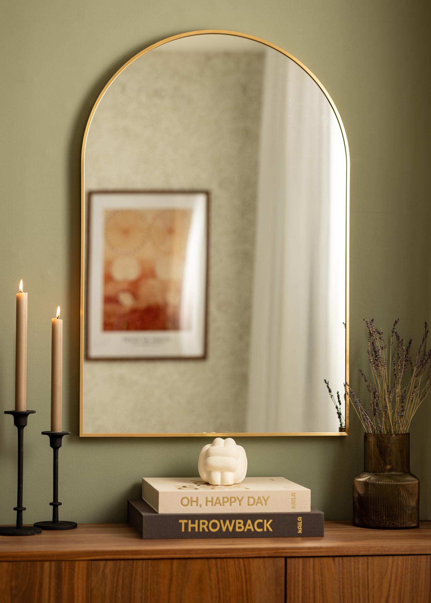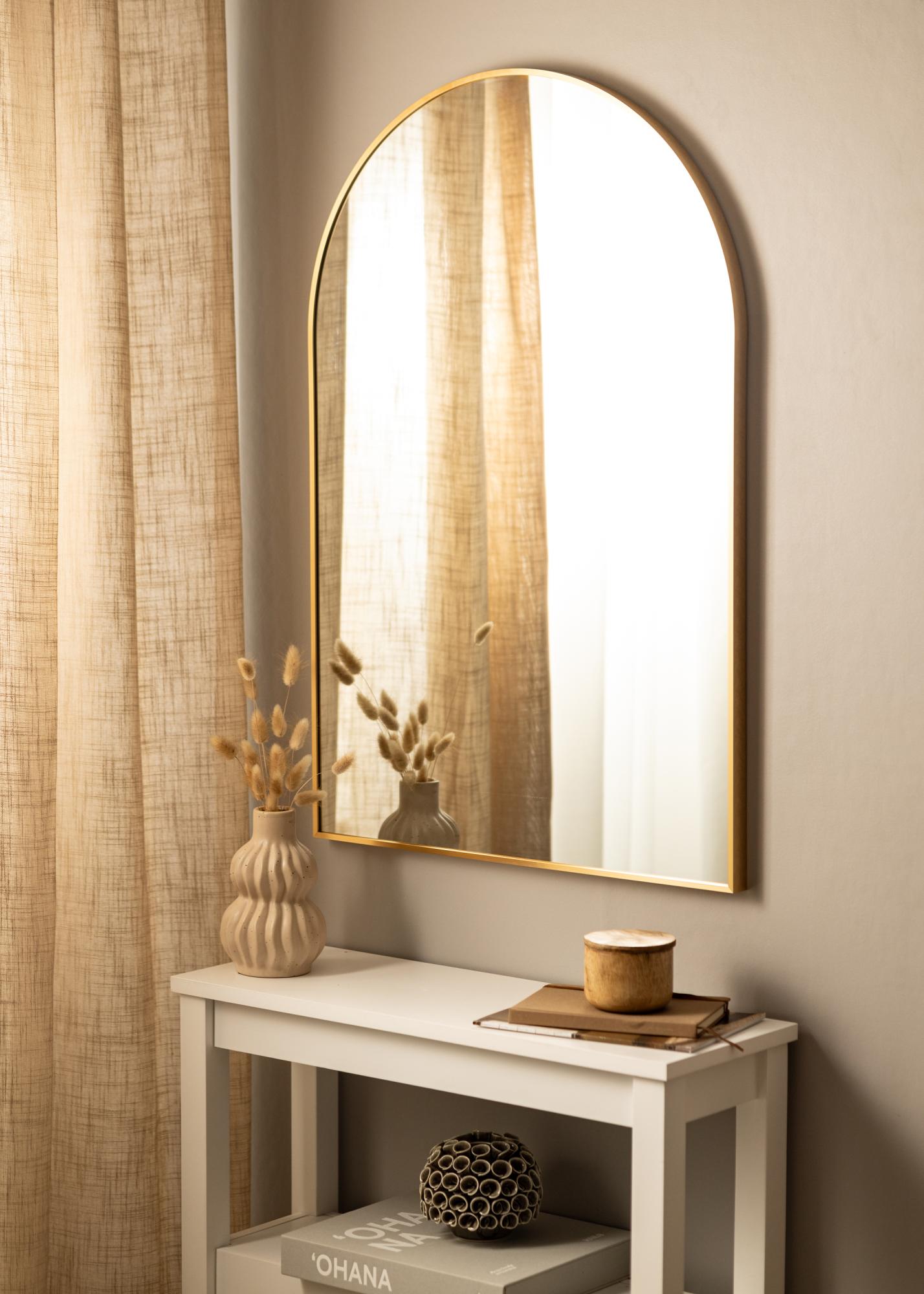 This is a modern wall mirror that’s a great addition in every room. It’s the perfect trendy decor detail to brighten up your bedroom or living room as well as being ideal for your bathroom or hallway so you can do last minute checks before you leave the house for the day. The mirror has a 28 mm deep metal frame in an exclusive gold colour which exudes finesse. The exquisite arch inspired design adds to the already luxurious feel.
