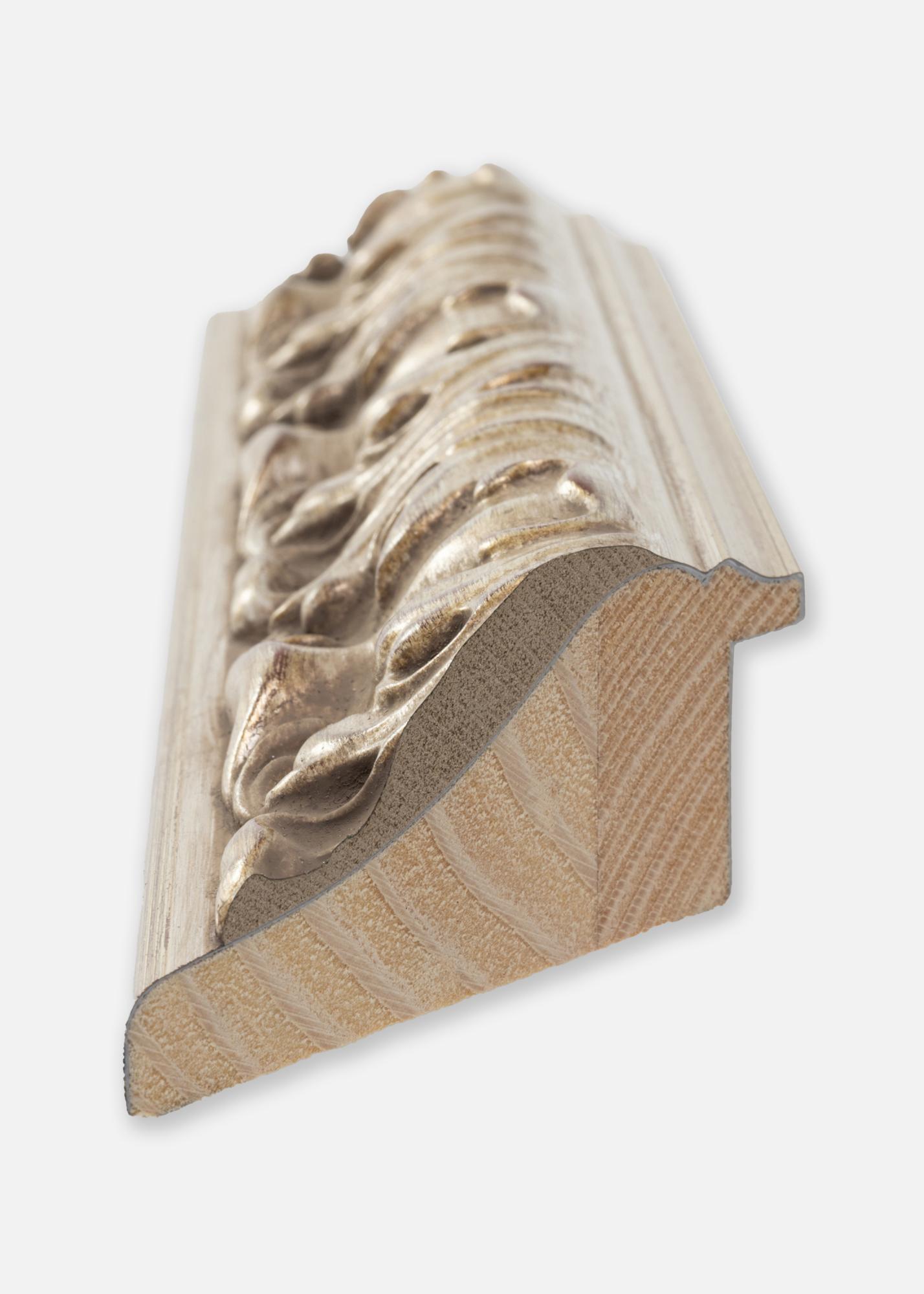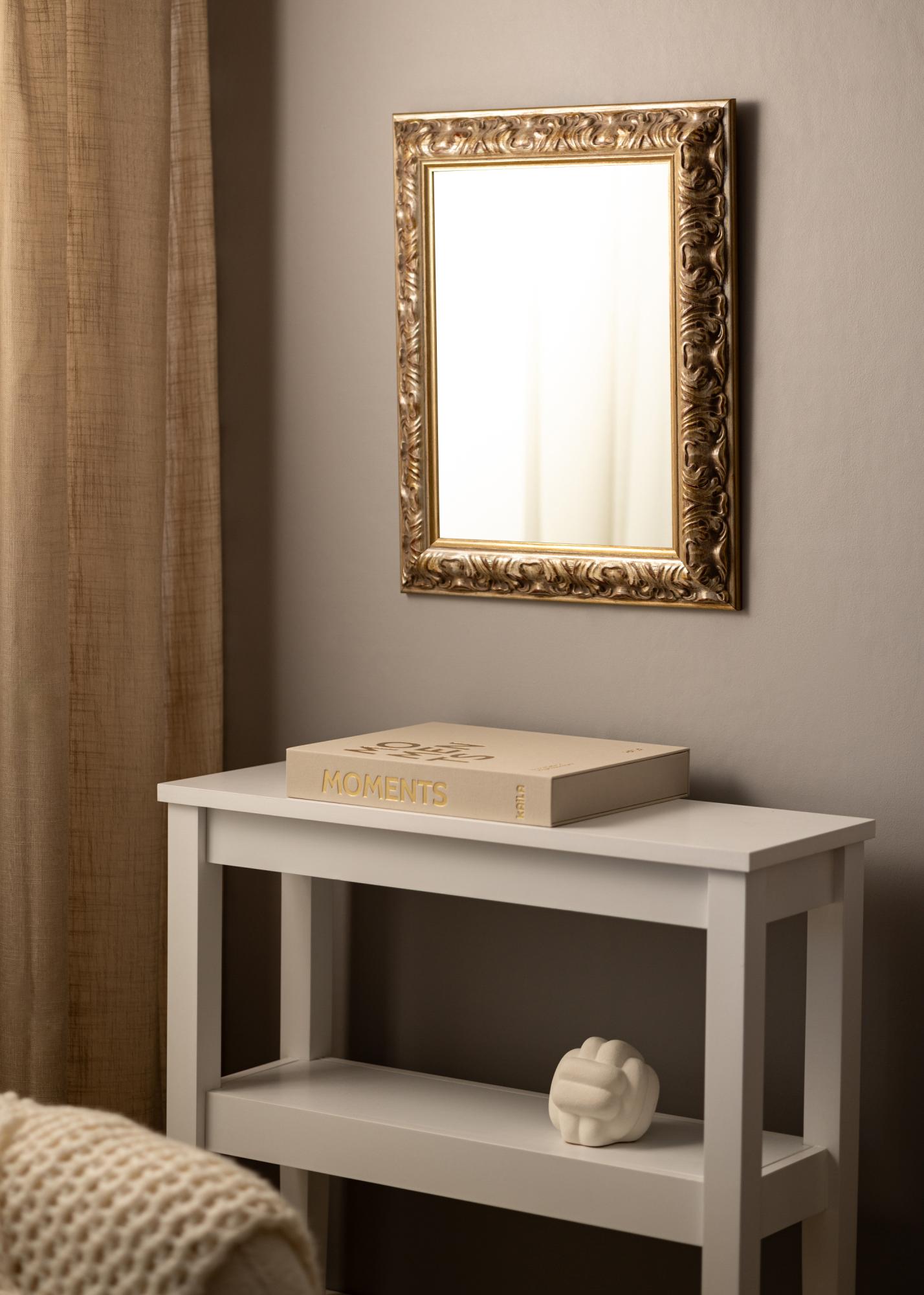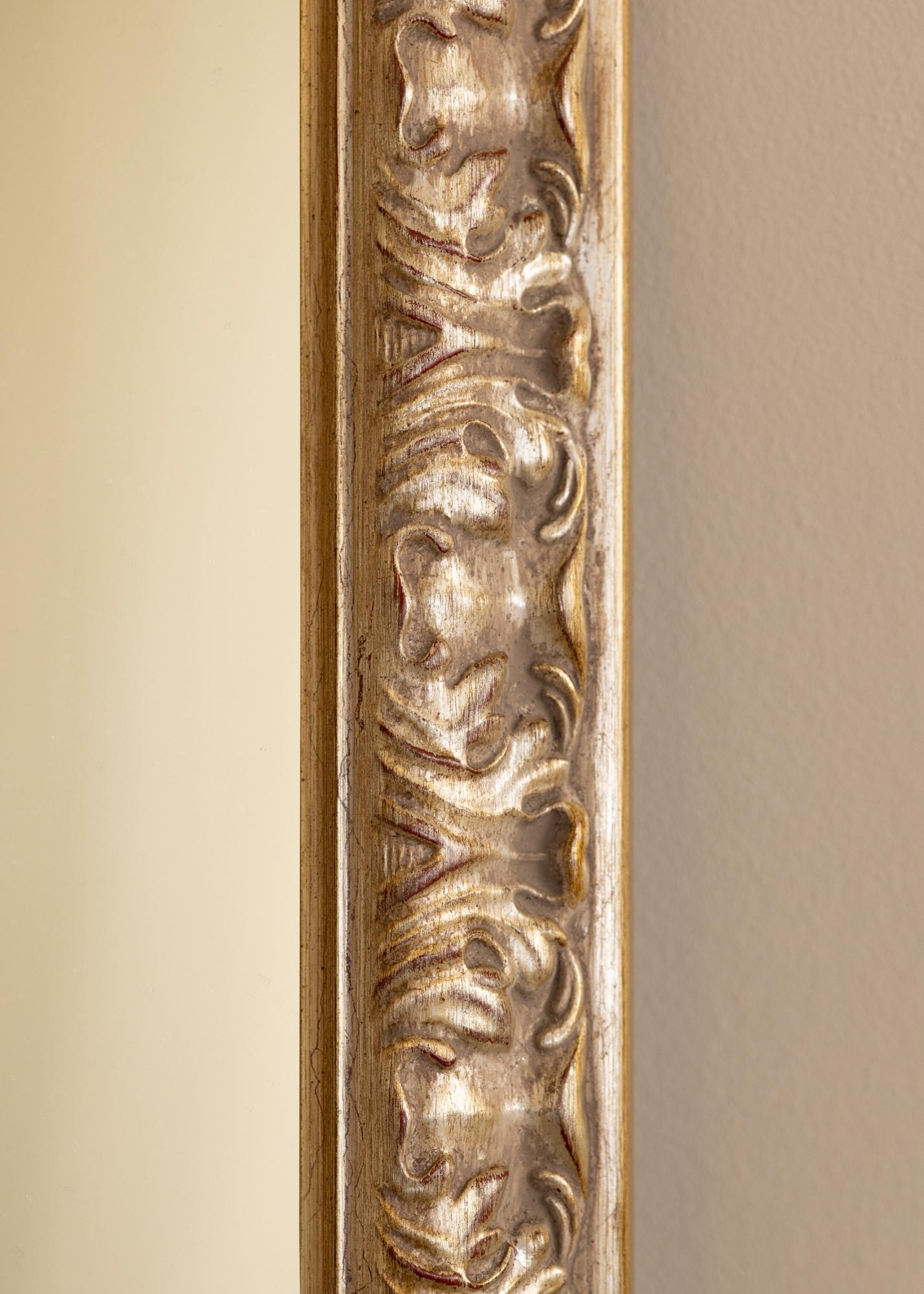 The frame is made of pine and has an antique silver finish with subtle gold details and red elements. This color combination creates a beautiful contrast and gives the mirror a classic and sophisticated expression. The decorative appearance makes the mirror perfect for frames where an elegant feeling is desired.