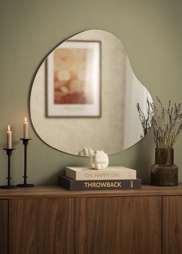 The mirror has a softly contoured, asymmetrical shape that gracefully curves and gives the impression of movement and softness. This design makes the mirror an artistic detail on the wall, while still maintaining its practical function.
