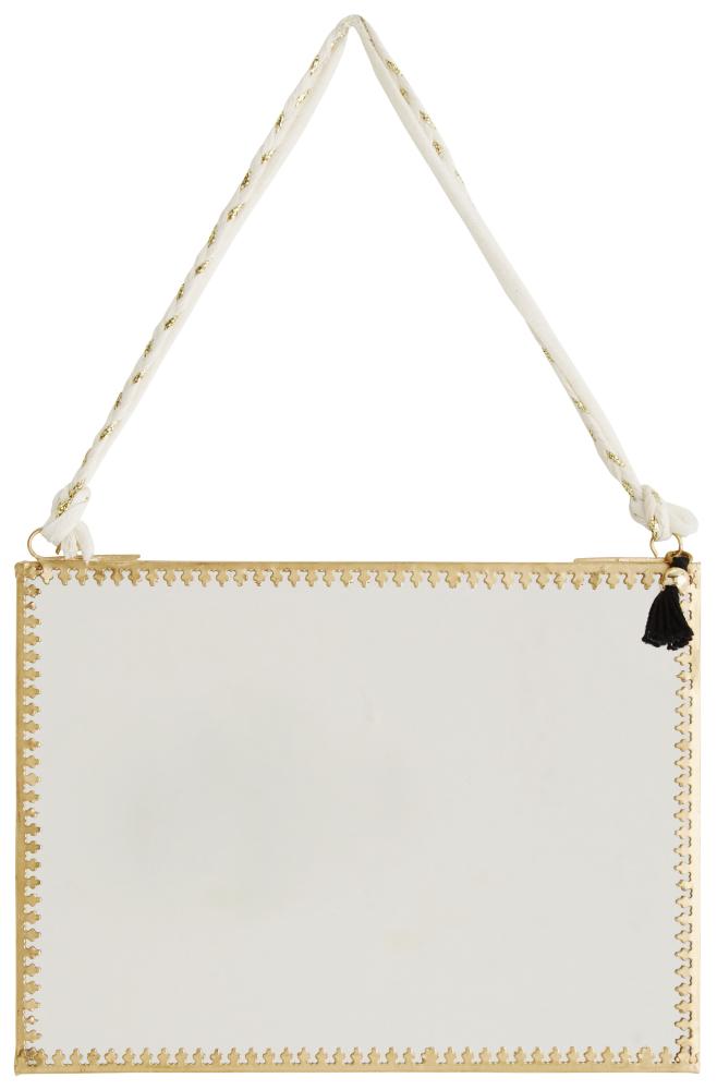 Beautiful mirror from Madam Stoltz, which looks fantastic in any room. The mirror has an elegantly shaped gold frame with a decorative tassel at one corner. The hanging strap is made of cotton, which gives the mirror an artistic finishing touch. The wall mirror is sized 20x15 cm, which makes it easy to display with other mirrors or wall decorations. The mirror is handmade and each example can vary slightly in appearance as a result.