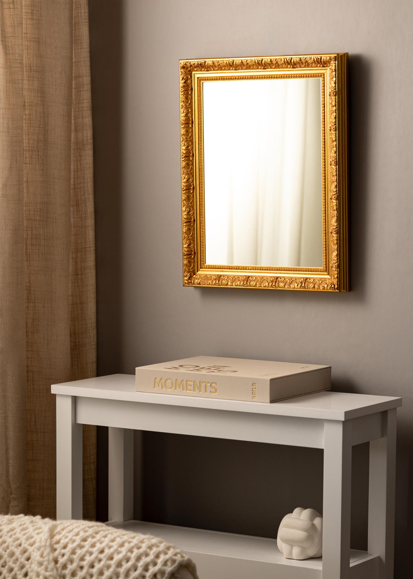 Mirror Vesta Gold is a custom-made mirror that is manufactured by us to suit your specific needs. With its classic design and elegant gold color, it becomes a stylish feature in any room. The mirror's frame is 51 mm wide and has a depth of 48 mm, which gives it a robust and solid feel.