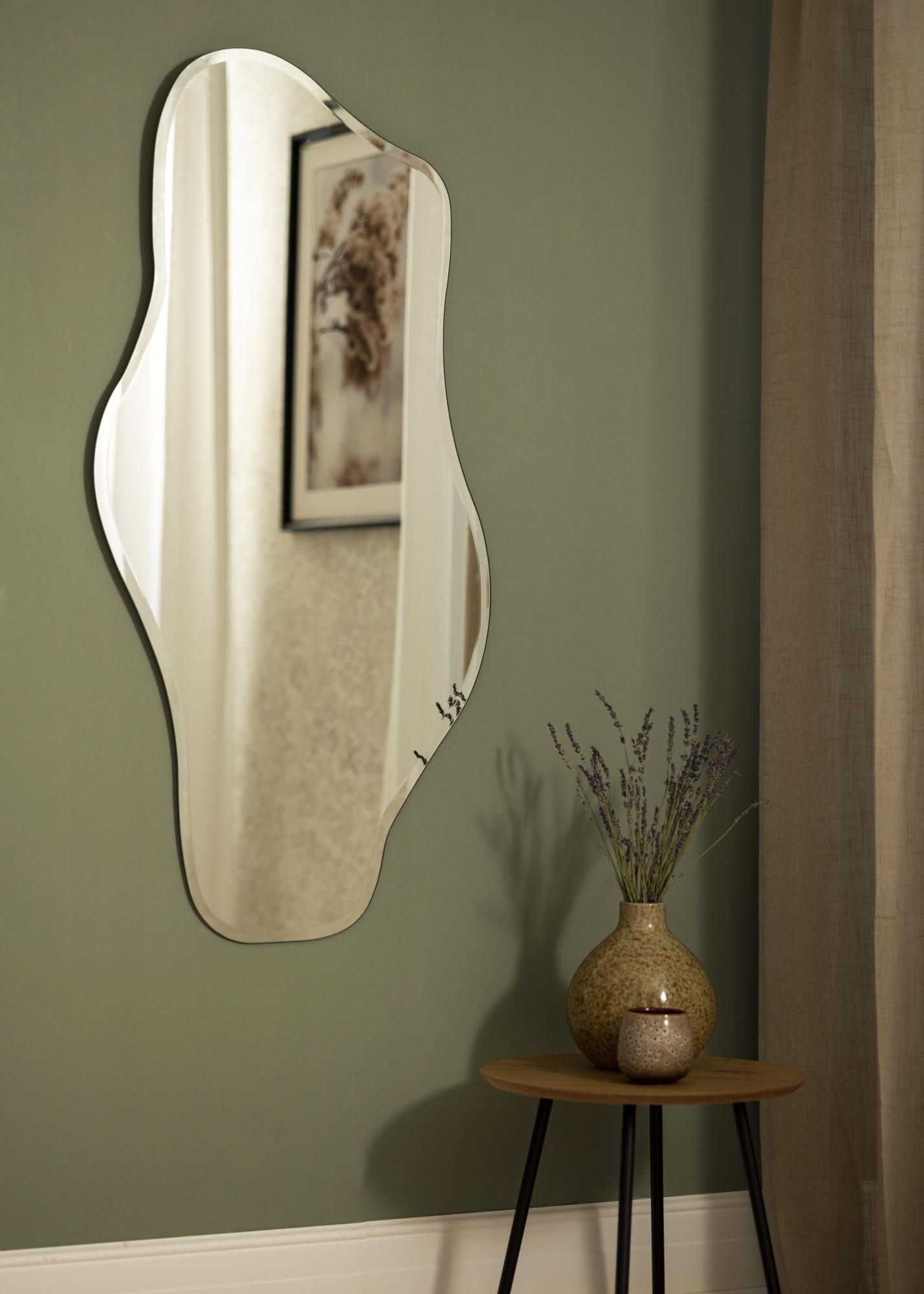 Discover a mirror that combines functionality with a unique aesthetic - a mirror that not only reflects your image but also your sense of style. With dimensions of 55x110 cm, this mirror is a practical and elegant interior detail for your home. Its design is elegant and fluid, with a distinct organic shape that is enhanced by the sophisticated faceted edge, giving a lift to any room.