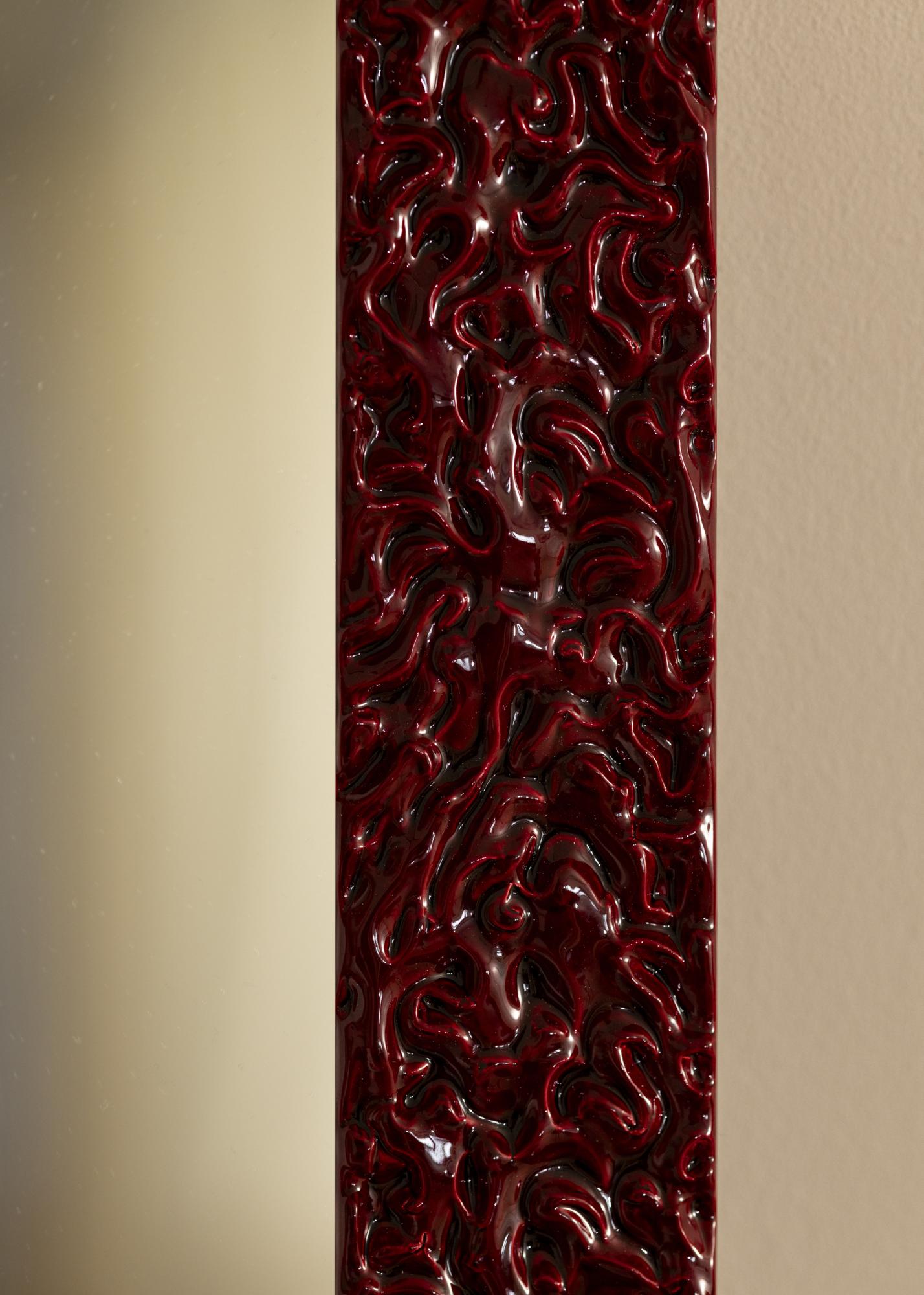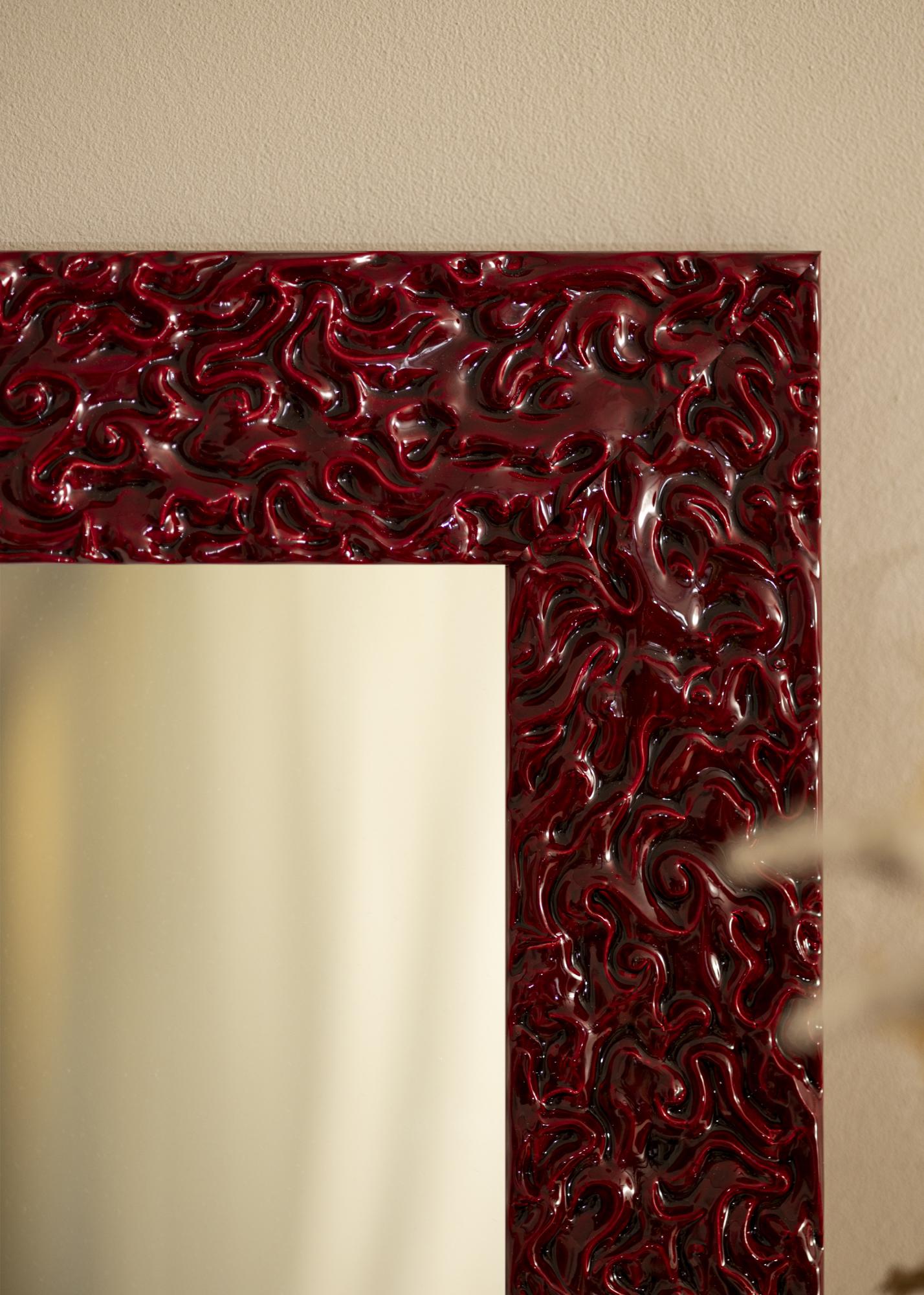 Mirror Westminster Red is a custom-made mirror produced by us to suit your specific needs. With its bold and vibrant red color, it becomes an eye-catching feature in any room. The lacquered surface gives the mirror a glossy finish that highlights its unique, organic relief structure. This creates a dramatic and modern touch that is sure to attract attention.