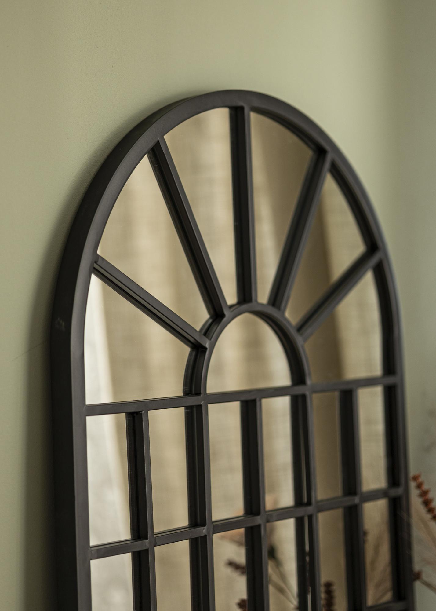The black metal frame gives the mirror a distinct and modern feel, while the arched top adds a touch of classic elegance. The shape of the mirror resembles a traditional window, creating an illusion of space and light in the room. The industrial style is complemented by the metal strips that divide the mirror surface, which not only adds a stylish detail but also contributes to the mirror's sturdy construction.
