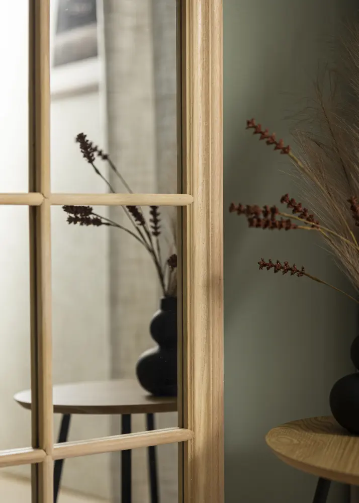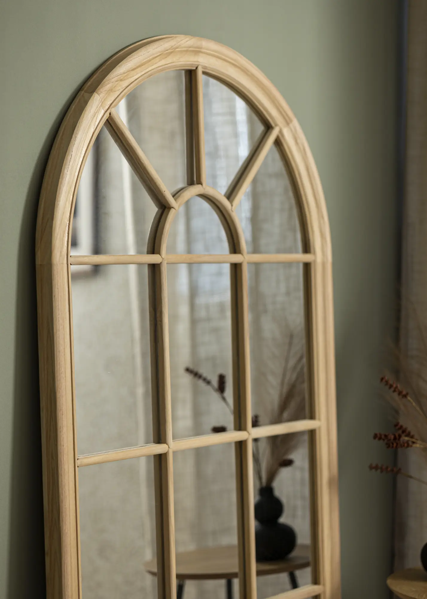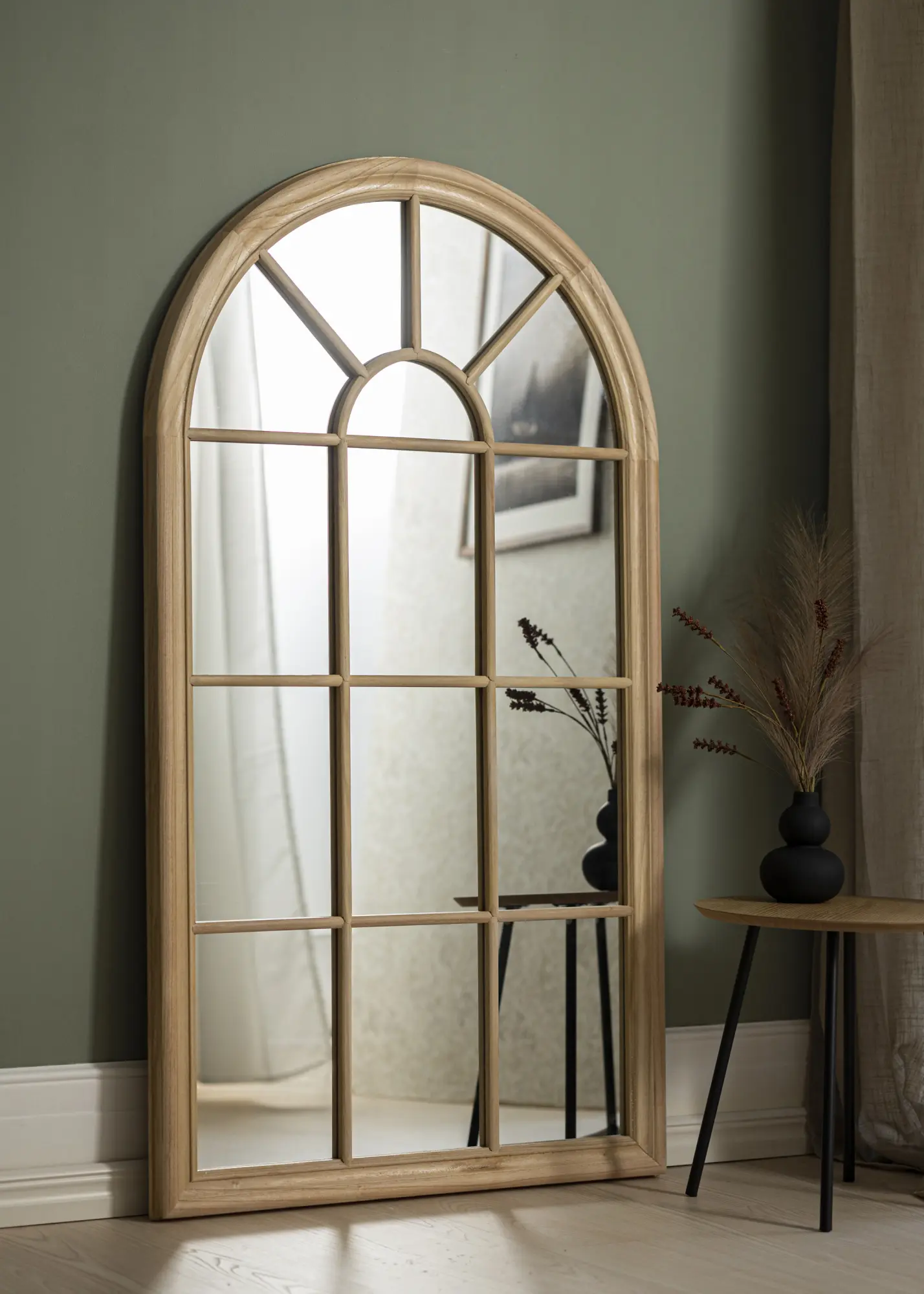 Discover the timeless elegance of our arched mirror, a design reminiscent of historic gothic windows. With its generous dimensions of 80x140 cm, this mirror offers a magnificent view and becomes a stately addition to your home. The natural wooden frame embraces the mirror glass, adding a feeling of warmth and tradition to your interior.