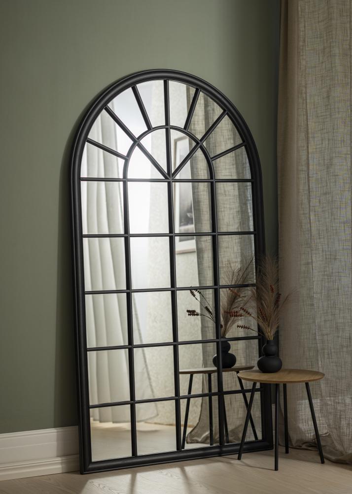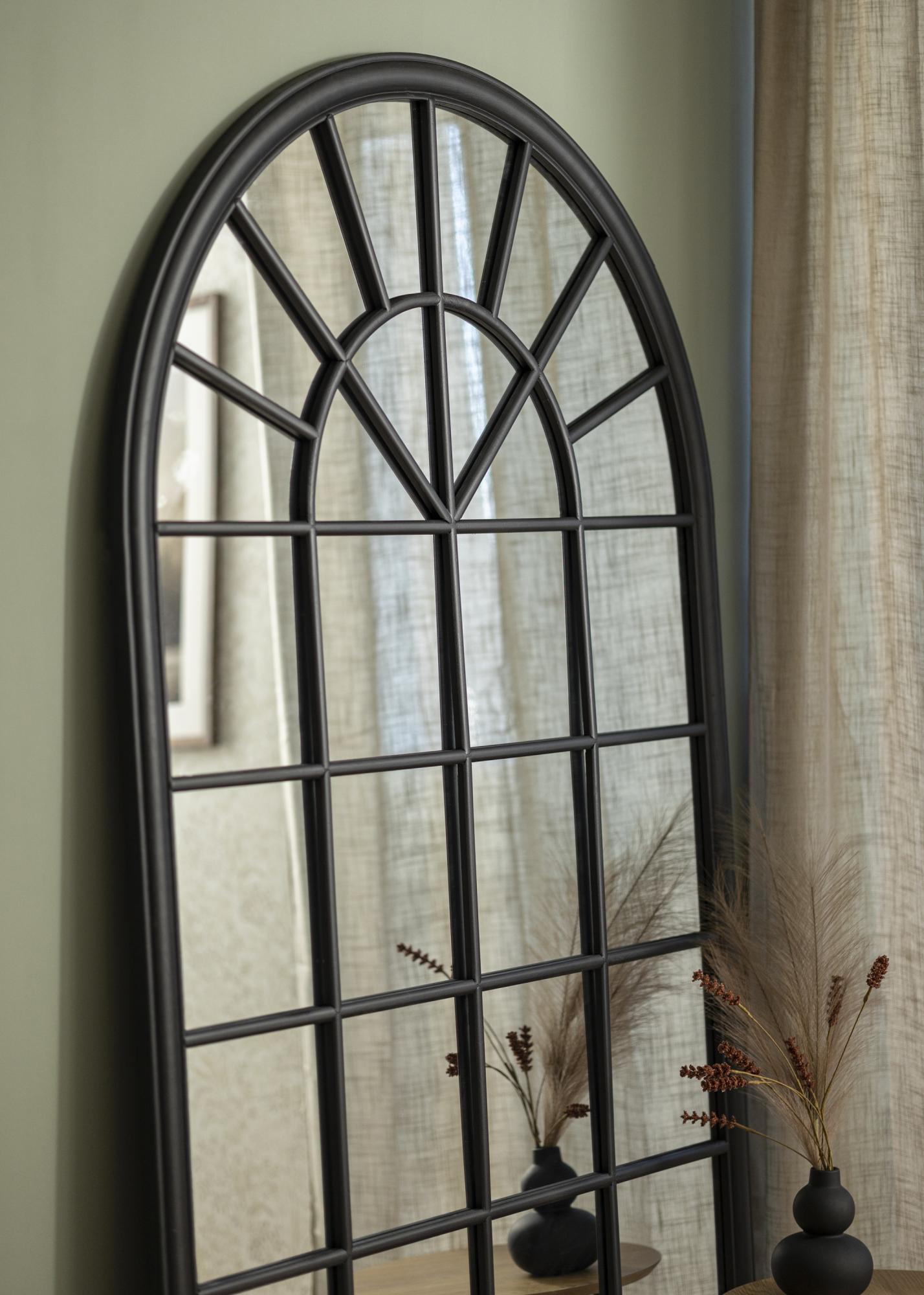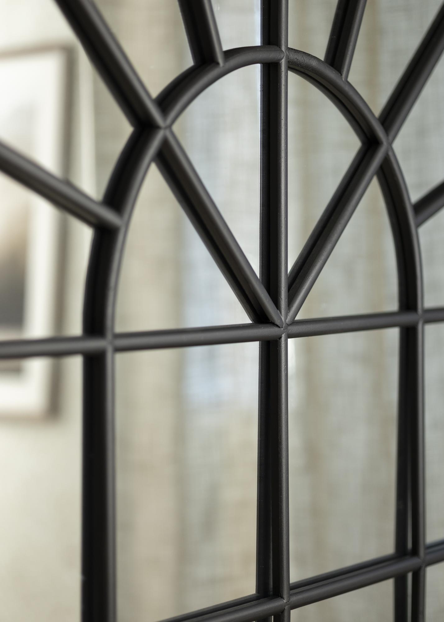 Discover the majestic presence of our unique mirror, a true eye-catcher for any room. With its generous dimensions of 103x180 cm, this mirror not only offers a practical function but also becomes a part of your interior design. Its impressive semi-circular arch shape is complemented by a captivating window-like grid pattern, giving the mirror a distinct industrial aesthetic.