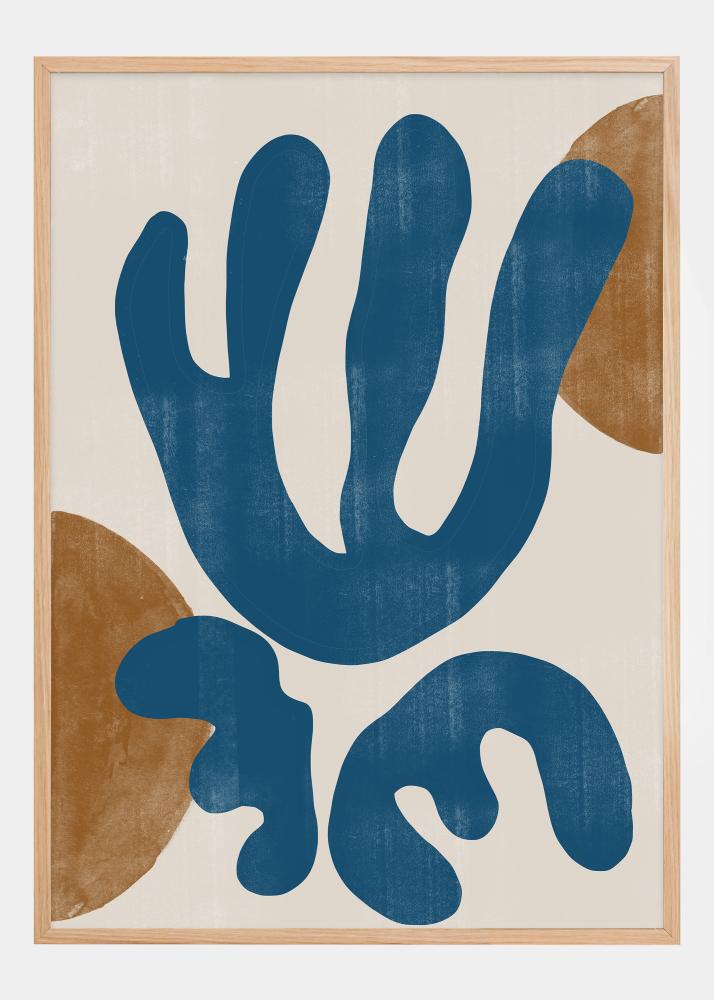 This vibrant poster combines bold shapes and an earthy color palette to create a sense of both modern art and the wonders of nature. The large, sweeping blue shapes evoke thoughts of water or vegetation, while the ochre details contribute with a warm and natural contrast. This design is an excellent example of how abstract art can emulate and celebrate the organic patterns in our environment.