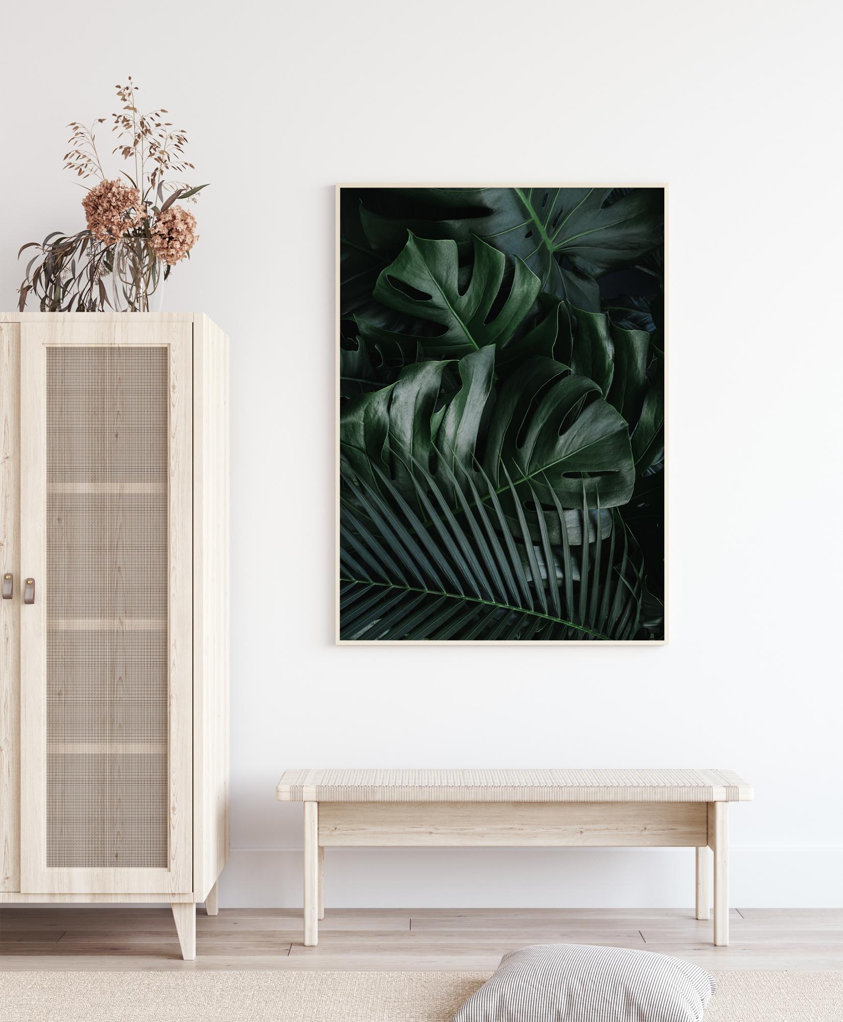 A leafy portrait of green Monstera and palm leaves. The natural light shines on the top part of Monstera leaves creating darker shades in the upper part of the print. The whole saw-shaped leaves create a warm relaxing feeling. A perfect print for anyone who loves plants.