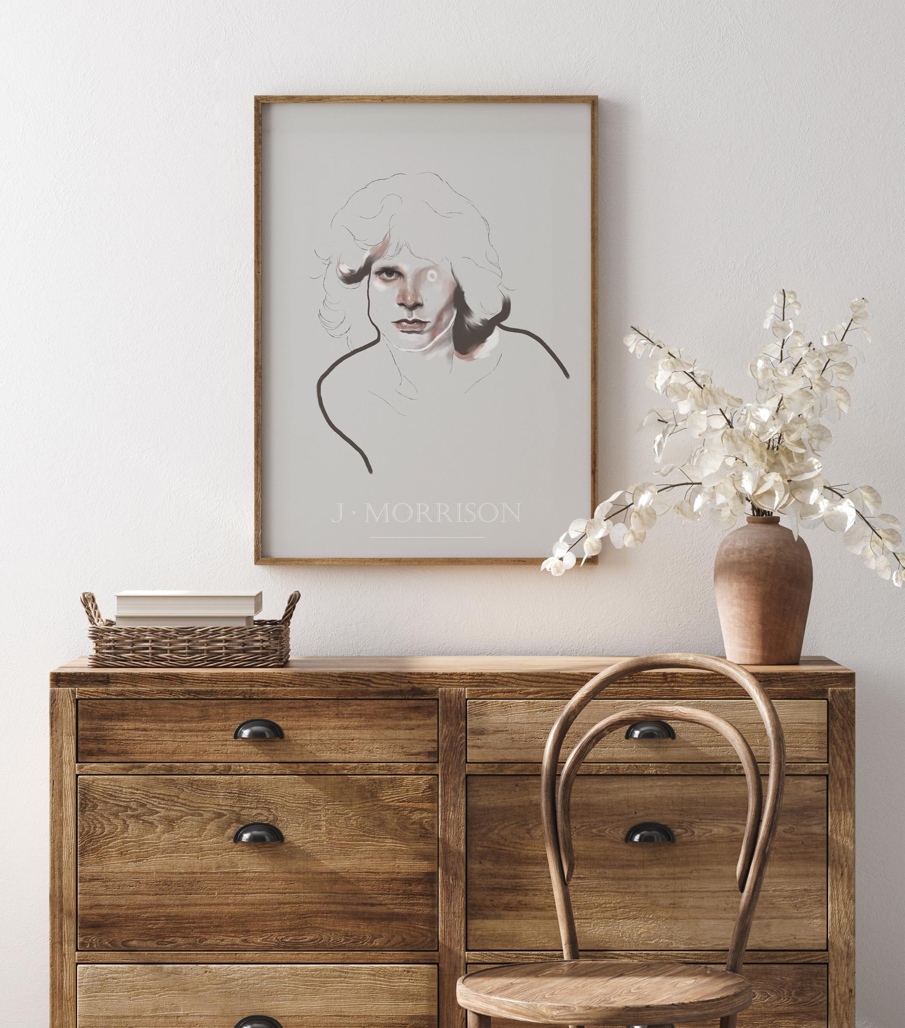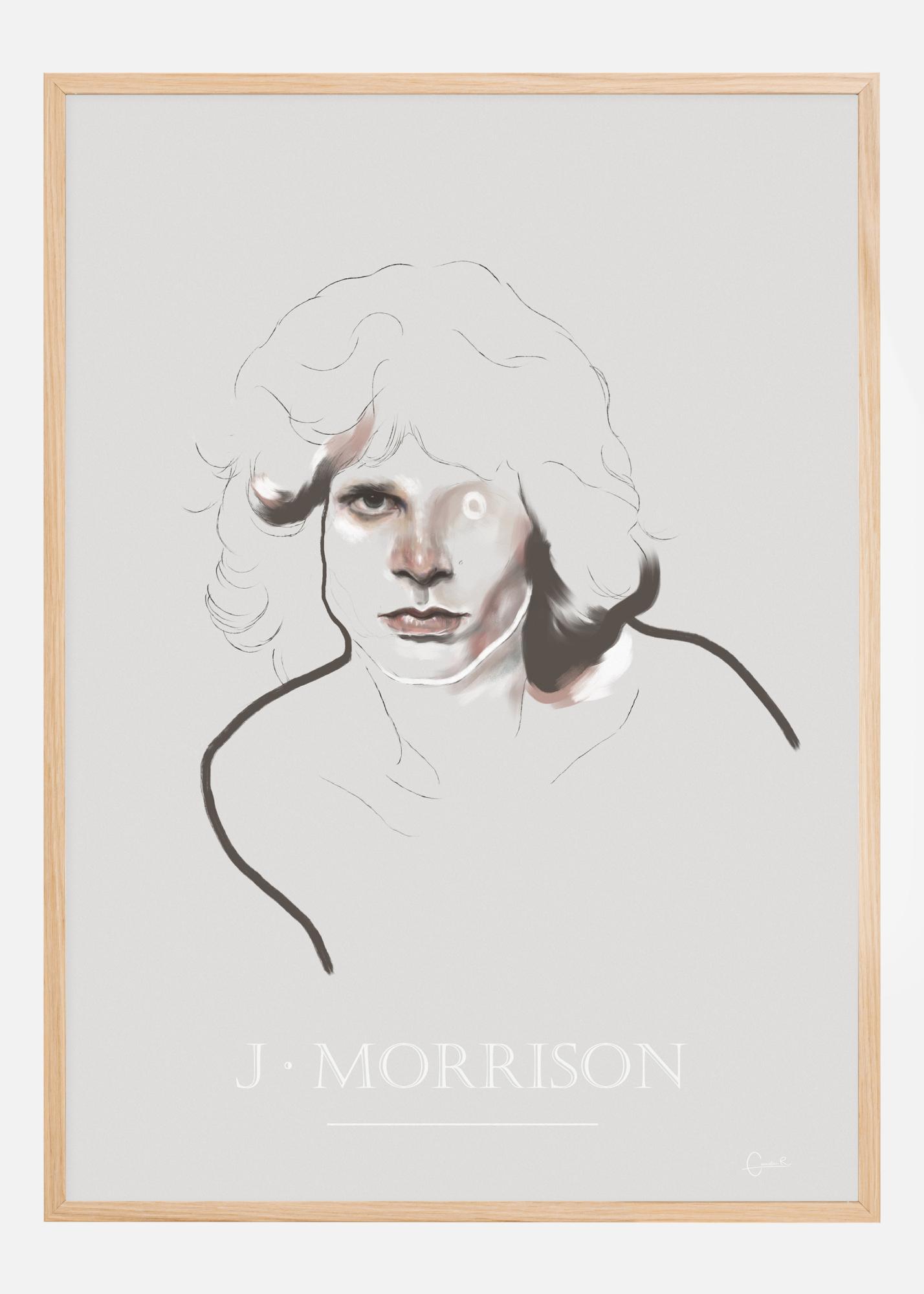 A beautiful poster of J. Morrison. Set on a beige background, the artist's head and shoulders have been drawn with a black pen, while the mouth with has been outlined in brown. The left eye is without eye lids. An ideal print for anyone who loves music.