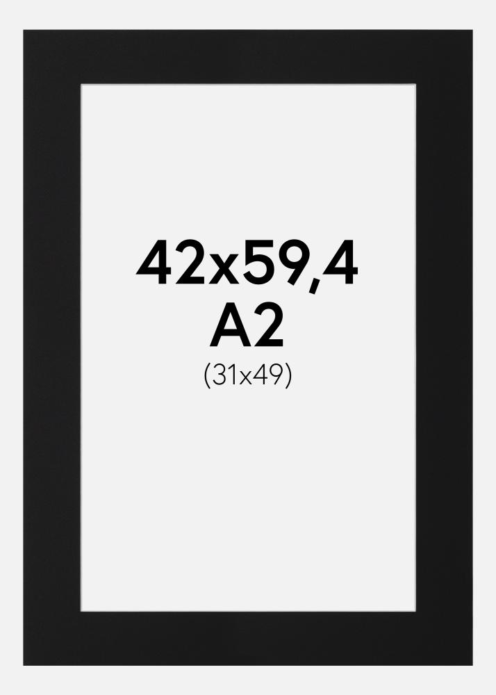 This elegant mat in black is the perfect choice to give your pictures and artworks a stylish framing. With a bevelled inner edge and a white core, a subtle contrast effect is created that adds depth and elegance to your subject. The mat is designed to fit images sized 32x50 cm, while the outer dimension is 42x59.4 cm, which corresponds to A2 format.