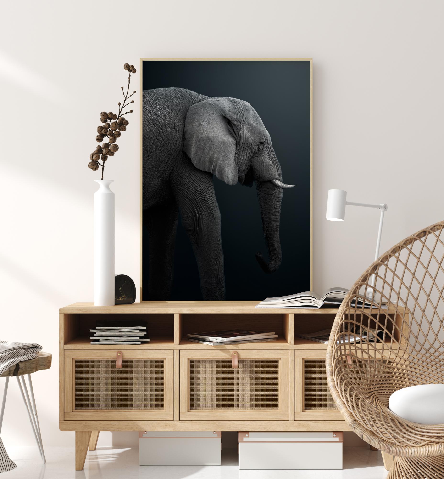 An adorable portrait of a healthy Namibian elephant. With the grey giant facing to the right, its trunk hangs. The dark blue background creates a feeling of sadness as the elephant seems very lonely. A beautiful print for any lovers.