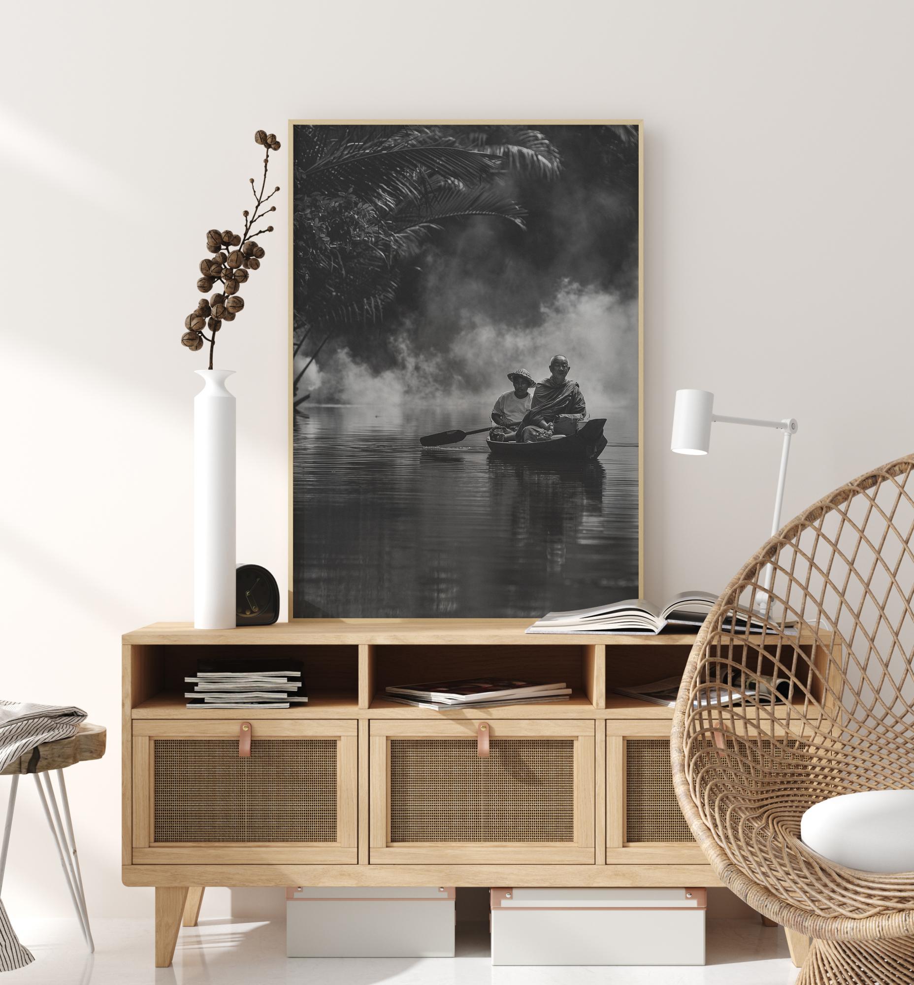 An peaceful black and white close-up photo of two men travelling down a river. Sitting peacefully on their Thai gondola fishing boat, two men seem to observe their surroundings. The natural sunlight shining through the clouds reflects the boat on the water. You can almost hear the silence of this picture. Ideal for a quiet environment.