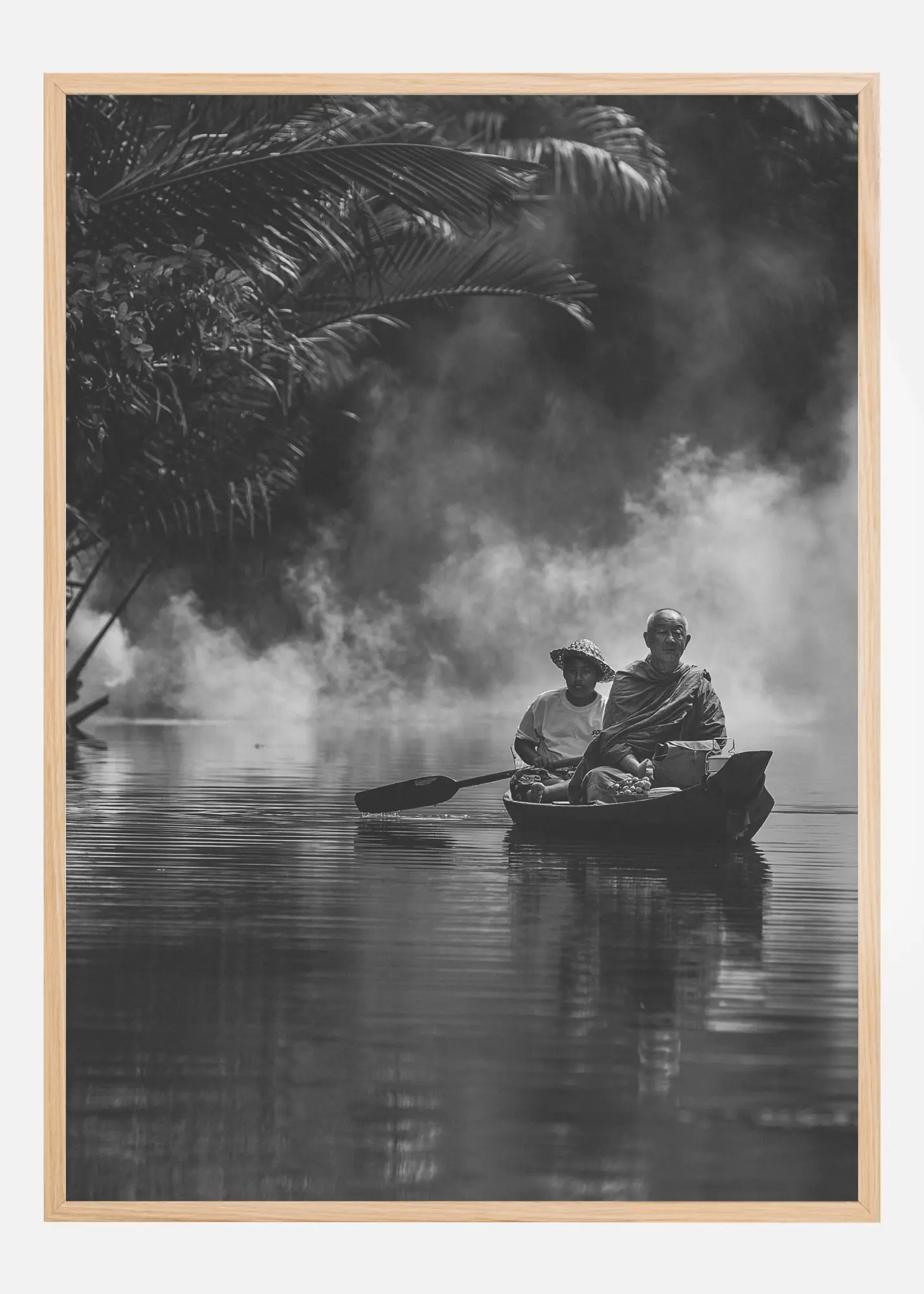 An peaceful black and white close-up photo of two men travelling down a river. Sitting peacefully on their Thai gondola fishing boat, two men seem to observe their surroundings. The natural sunlight shining through the clouds reflects the boat on the water. You can almost hear the silence of this picture. Ideal for a quiet environment.