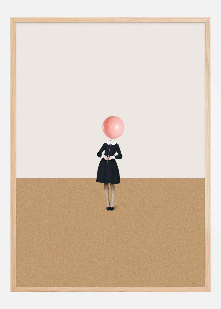 This artistic poster captures the attention with its simple yet powerful image of a woman dressed in a black dress, standing alone against a background of warm sand tones. She holds what appears to be a perfectly spherical, pink bubble above her head, creating a visual and thought-provoking contrast between the person and the surrounding surface.