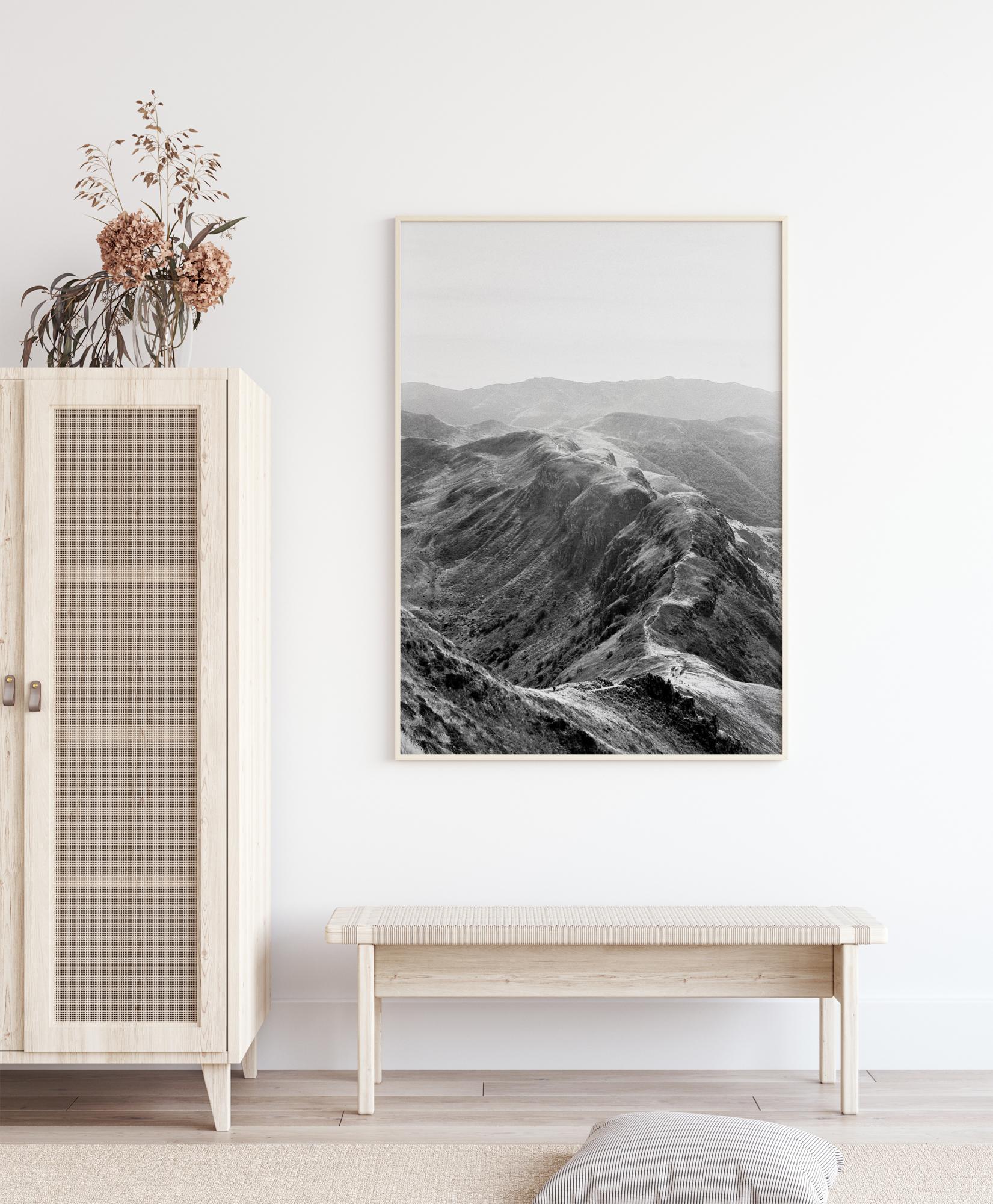 A black and white print of a mountain range. The different shades of grey all blend in perfectly with each other. With no sign of vegetation or life, you can almost hear the silence on the mountain tops. Hang this print on a colourful wall and listen to the wind blowing.