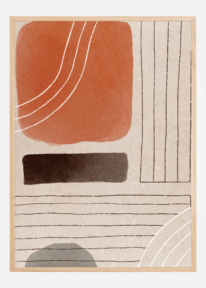 This artful poster plays on abstraction and geometry, evoking a deeper sense of reflection. In the motif, there is a large, rich terracotta square that anchors the design, bordered by white curvy lines that give the impression of movement and softness. This warm, earthy color creates an immediate sense of warmth and welcome.