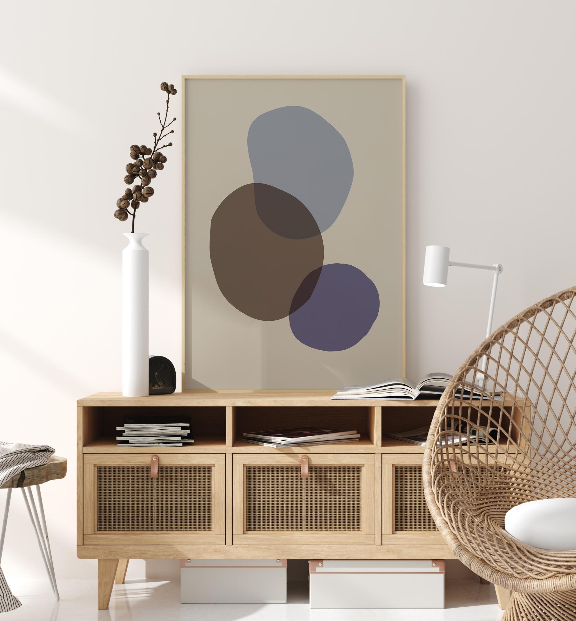 A fantasy print of three different coloured shapes. Set on a cream coloured backdrop, the brown, grey and mauve shapes overlap each other. The brown shape dominates over the smaller purple and grey shapes. A simple print to hang in your home. Use your imagination as to what the shapes represent.