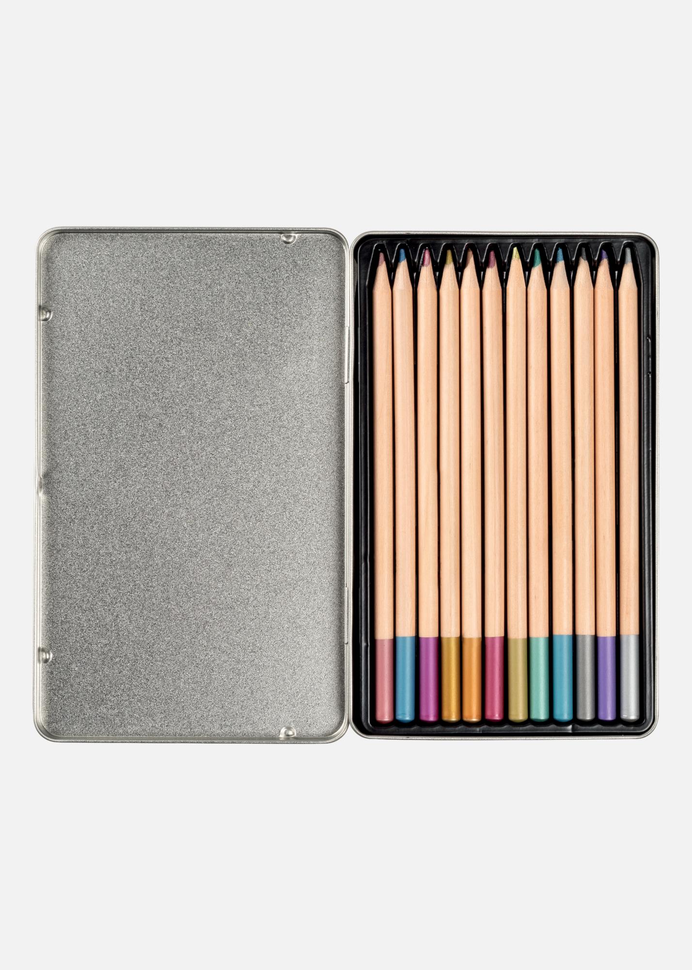 PAC Pens Set Metallic contains 12 metallic colored pencils that provide a stylish and shimmering effect on both light and dark paper. Perfect for scrapbooking, photo albums, and creative projects. The set includes the colors gold, silver, copper, pink, red, purple, blue, light blue, green, light green, brown, and black.